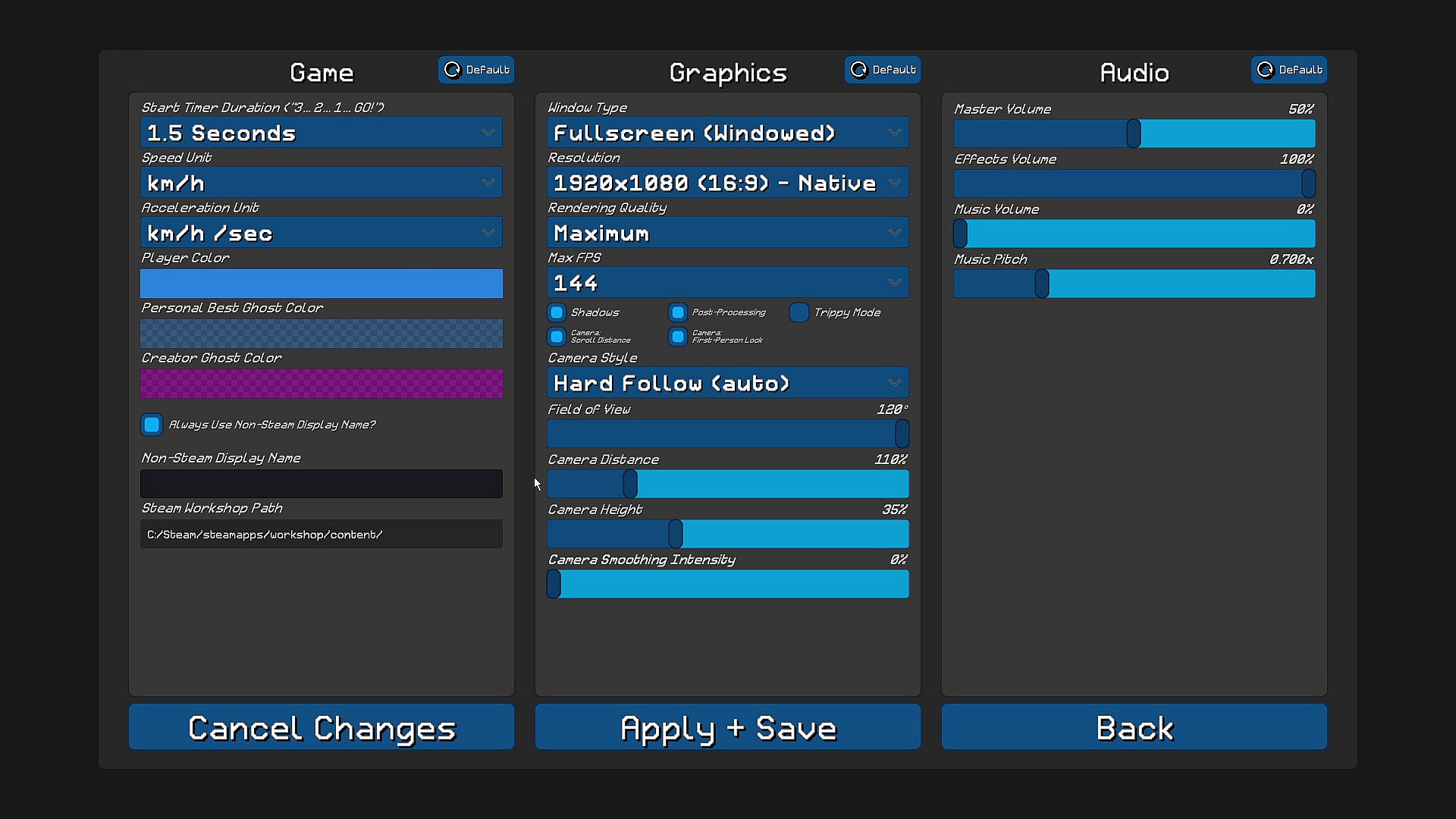 - Race replay files: autosaves your last 25, your personal bests for every level, and you can manually save any race you want. They can be viewed at any time, and slowed down or sped up.