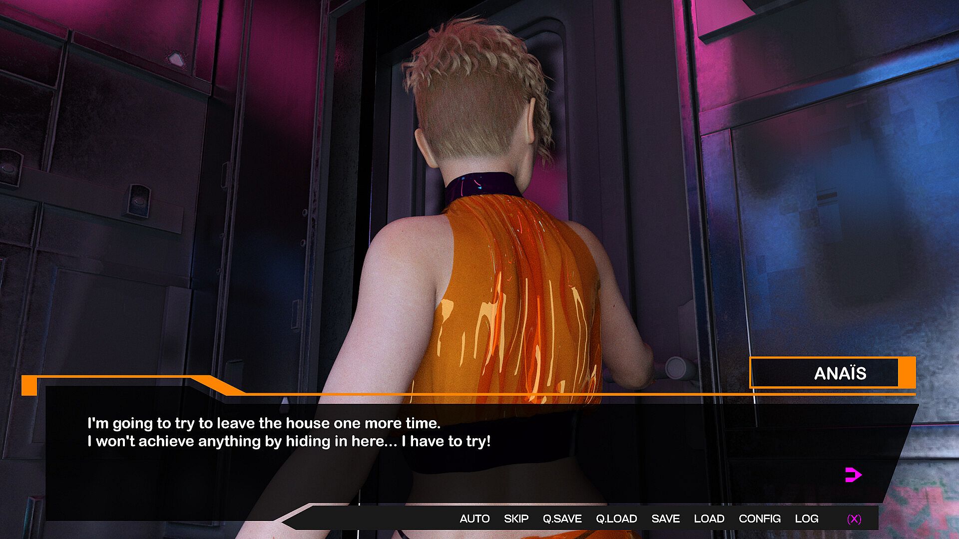 Anaïs is a professional of pleasure. She works remotely, engaging with clients across every sector of the neon-drenched megalopolis—and perhaps beyond. Her services aren't mere exchanges of desire; they are tailored experiences, immersive performances where sensuality and simulation meet. She is not defined by urges, but instead curates them, orchestrates them. She's not a victim of her condition. She's the architect of her domain.
