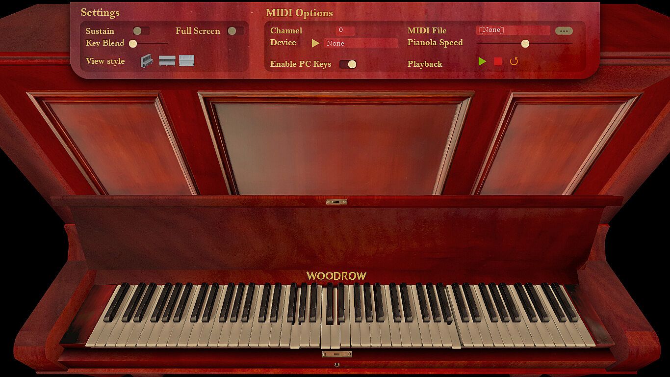 Woodrow the Old Piano is a novelty musical toy and MIDI player, using real sounds from a distressed antique piano. You can play this virtual piano using PC keys or a MIDI input device (such as a digital piano) or load in MIDI files to be automatically played pianola-style.