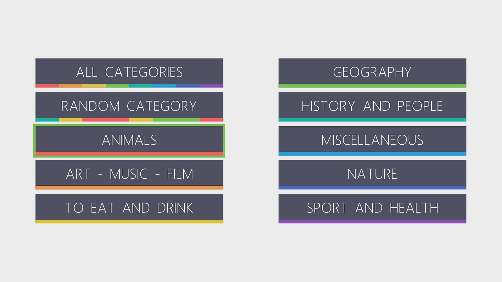 - 8 categories + random and mix all