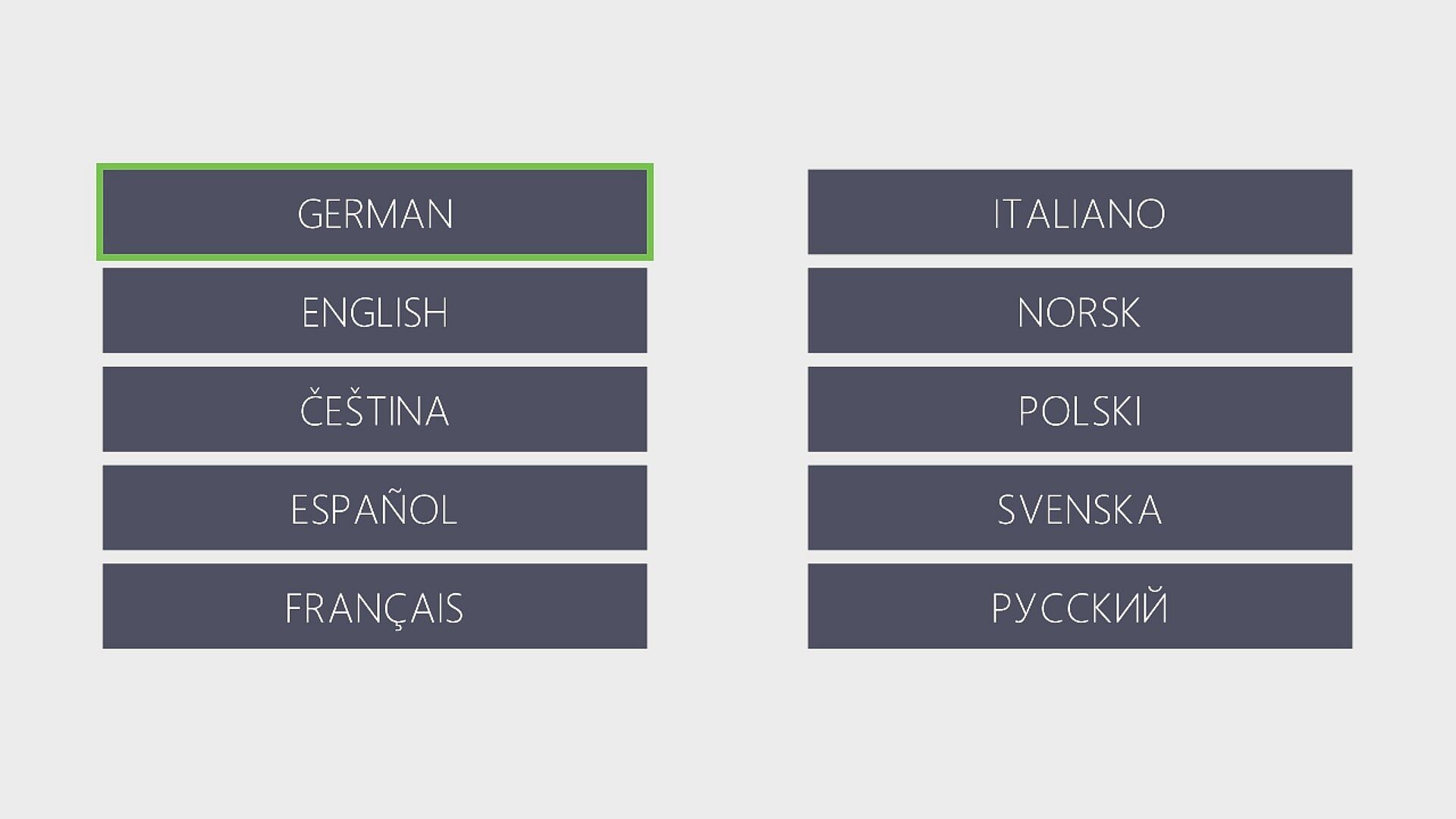 CzechGermanEnglishSpanish - SpainFrenchItalianNorwegianPolishRussianSwedish