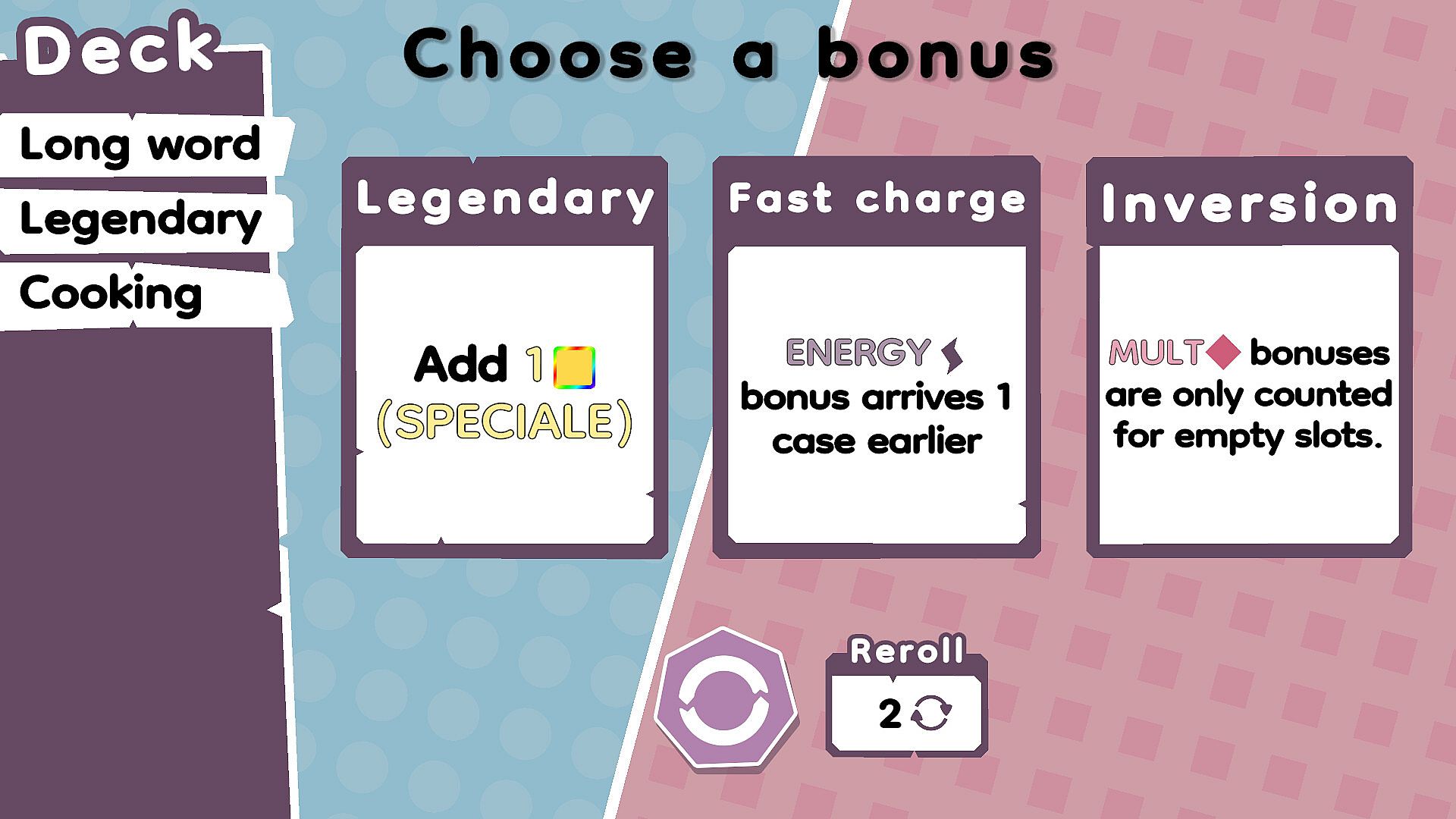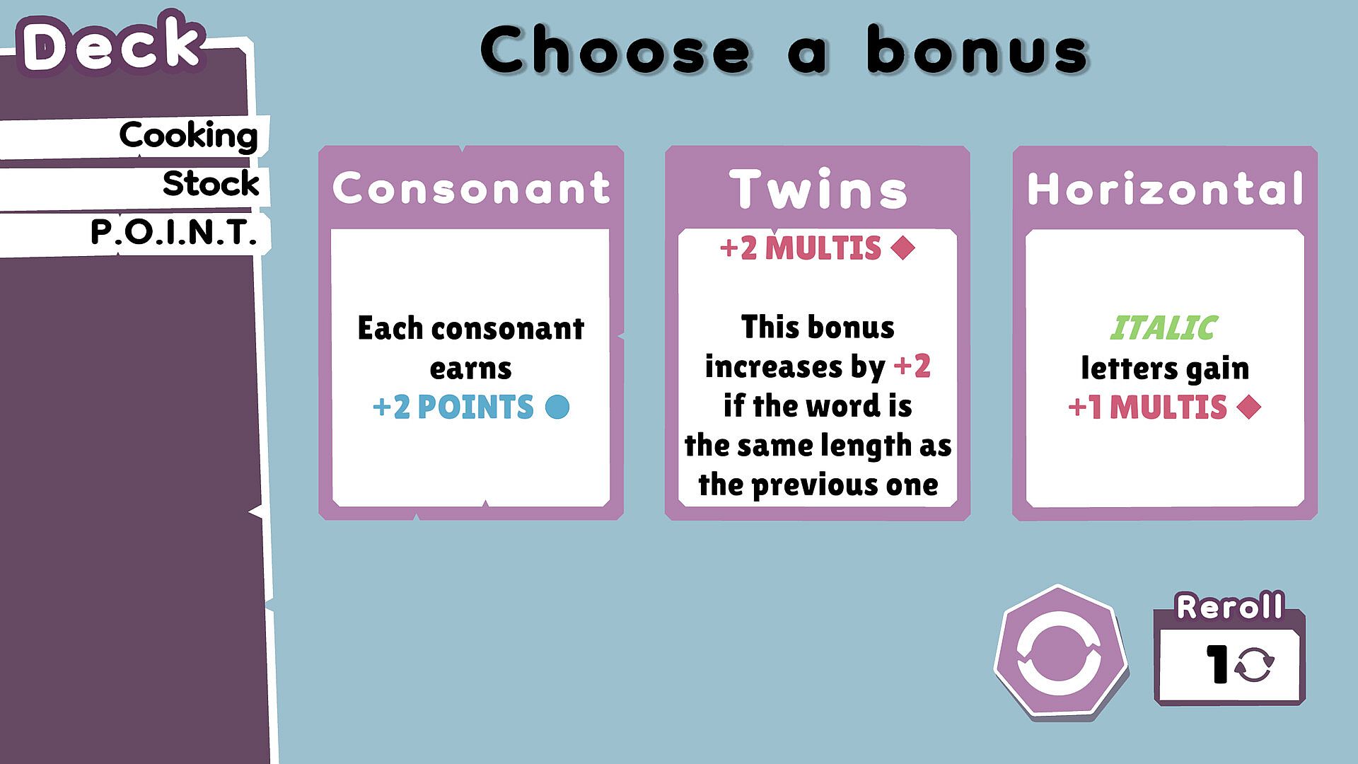 No two runs are ever the same! Each run presents a fresh combination of letters, bonuses, and challenges. With over 50 bonuses and challenges, Wordatro! offers an endless replayability. Start a new run, test different playstyles, and experiment with new strategies!