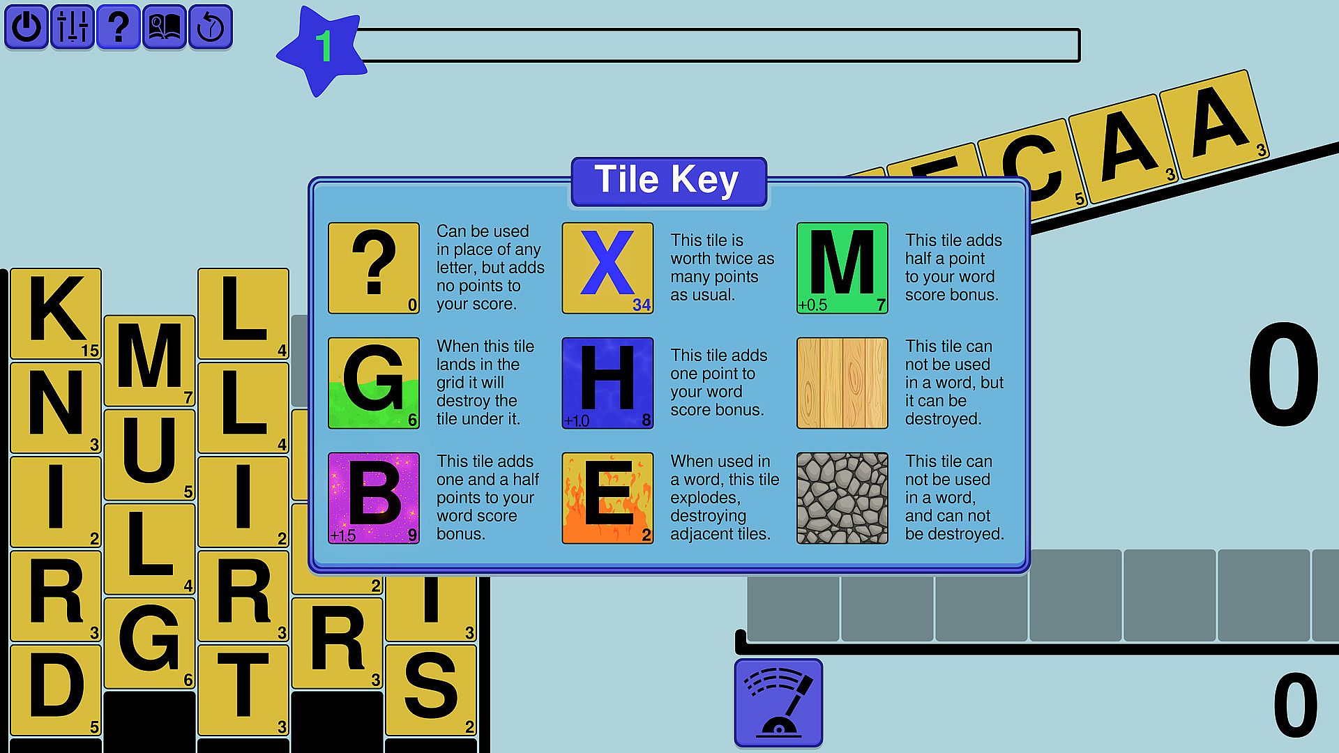 Up to six letters will appear in the input tray. The player must choose where to drop the letters in a grid, which causes a new random letter to be added to the input tray. Selecting adjacent letters in the grid that spell an English word allows the player to score points based on the letters used and the length of the word. After a certain number of letters have been successfully used in words, the player advances to the next level. In each new level, a new type of letter tile with special properties is introduced. These new tiles increase the word score or create new challenges such as destroying other tiles or filling the grid. When the grid is full, no more tiles may be placed, and the game is over.