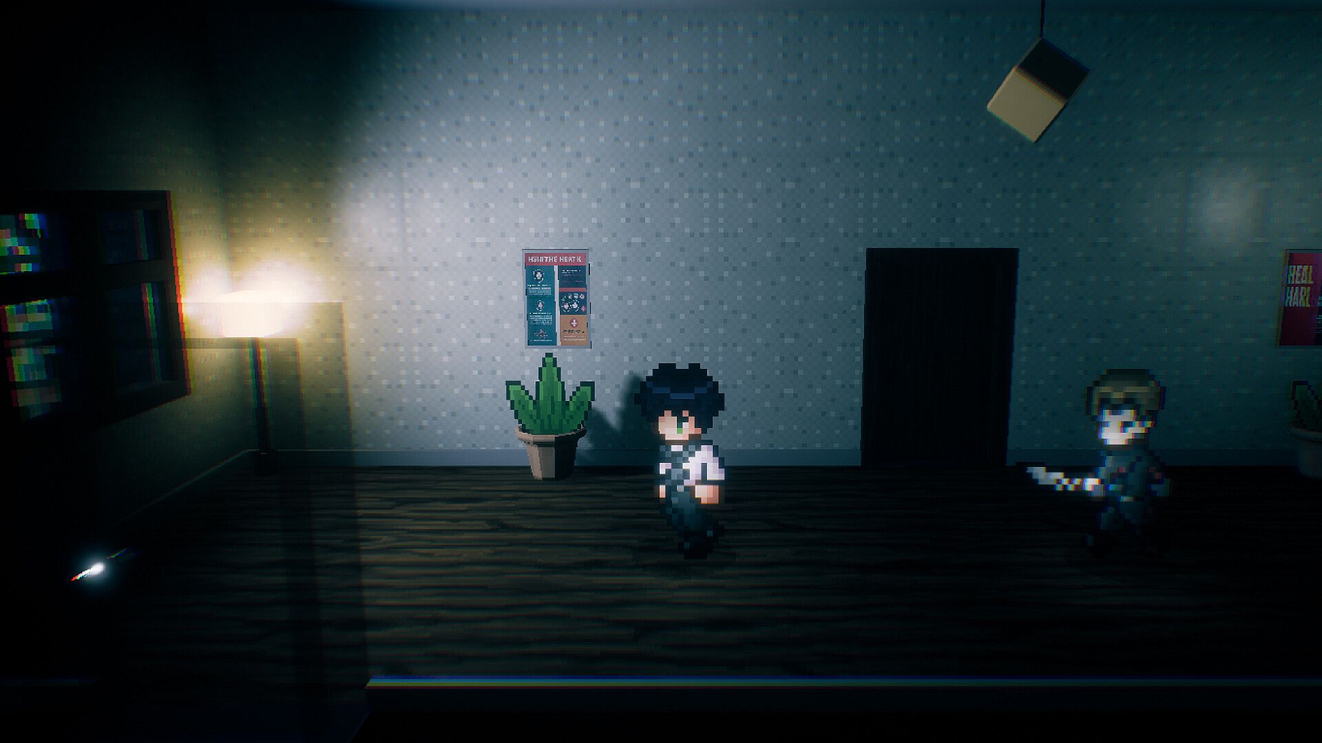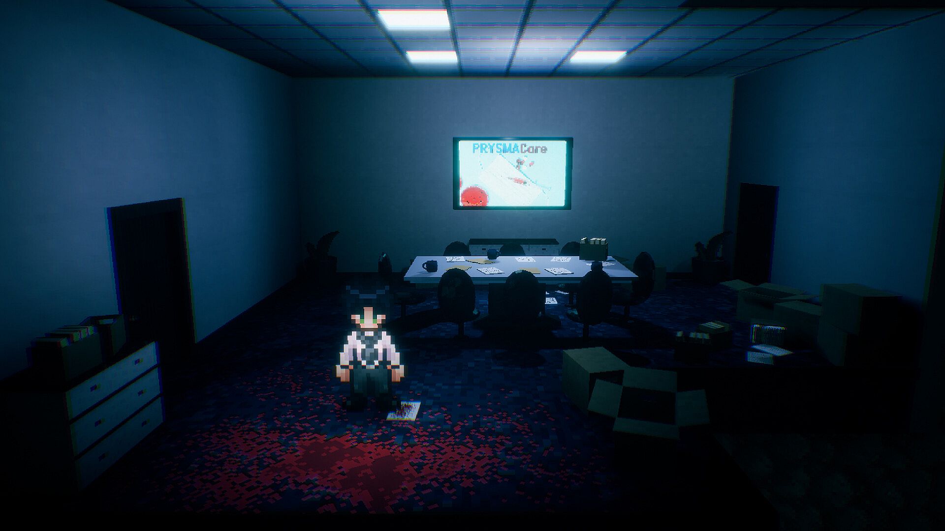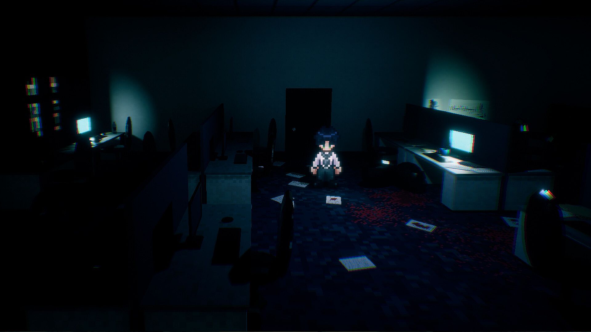 2D pixel art characters appear in richly lit, cinematic 3D environments that make ordinary office spaces feel both unnerving and visually pleasing. Visually, the game embraces a striking HD-2D presentation, with sprite-animated characters layered into tactile office environments, where copy machines, glass meeting rooms, and carpeted hallways transform into uncanny backdrops for a story that blends modern realism with unsettling nostalgia.
