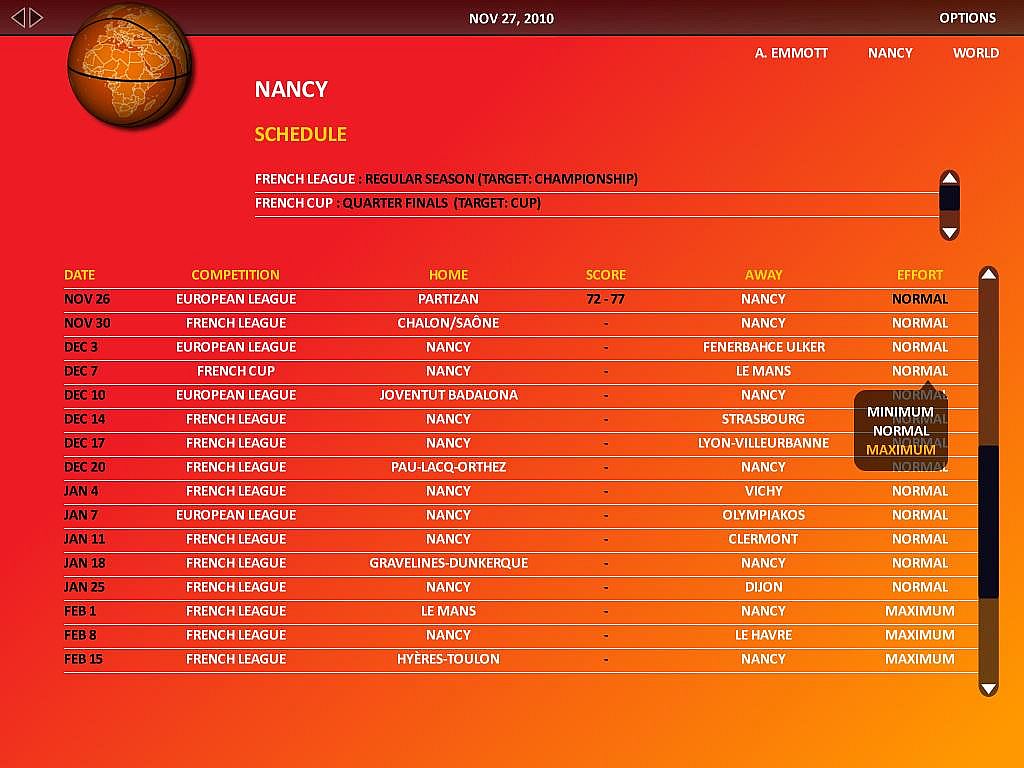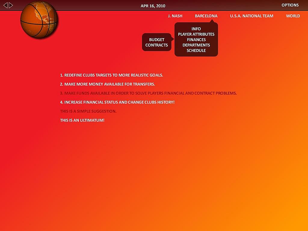World Basketball Manager (WBM) is a basketball strategy game. It uses the same game-play principles as most soccer management games do. Entering the game, the player creates his manager profile and he is hired as the general manager of a basketball club and his task is to improve the team’s performance by analyzing the facts and making the right decisions. He controls the various club departments funding (medical, training facilities, youth academy), transfers, contracts, training and of course when the match day comes, he will have to select the team lineup, create the most appropriate strategy and find the way to victory by countering the opposing manager’s plans.