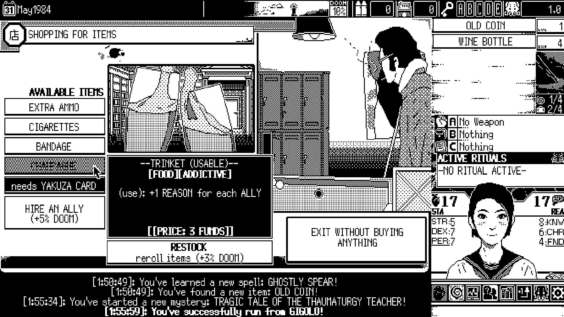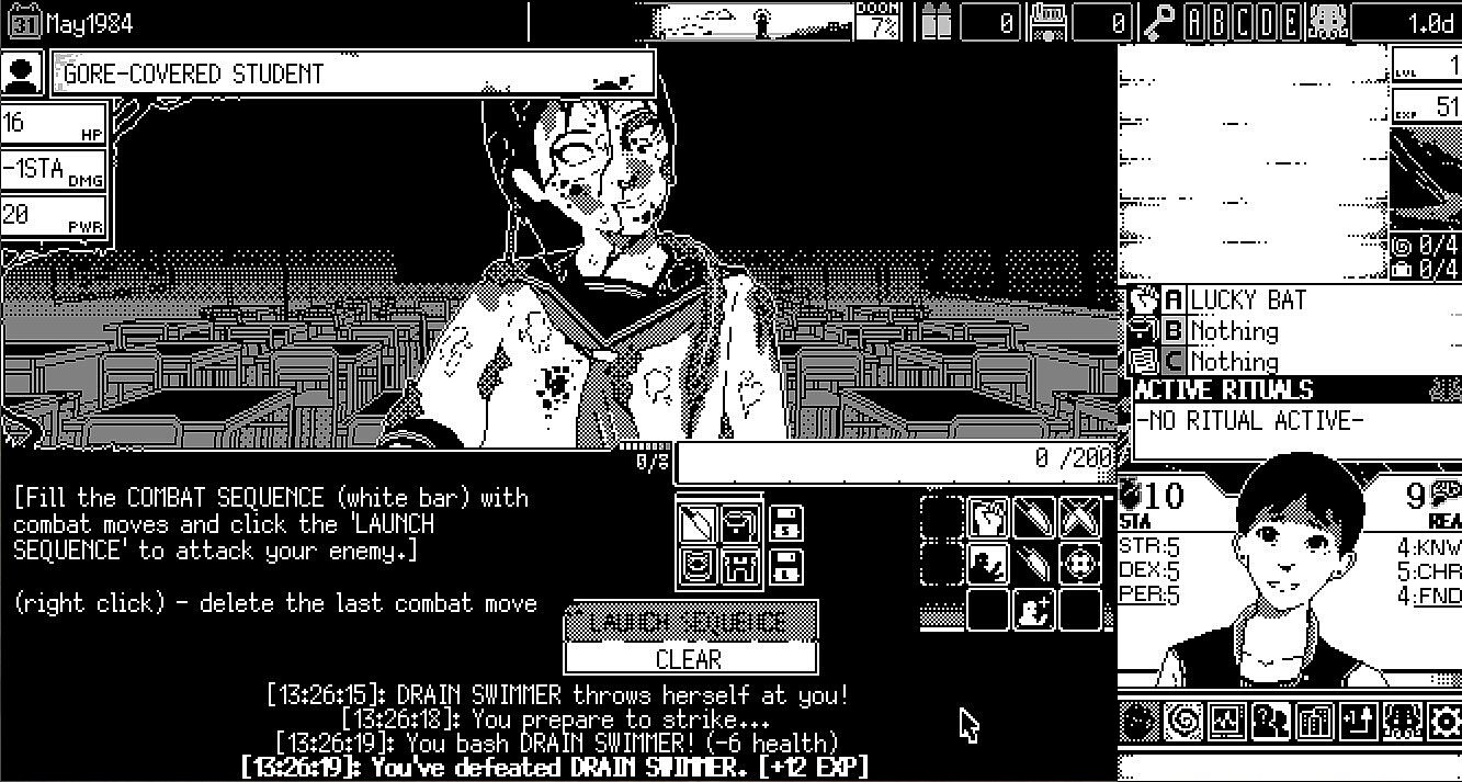 This is WORLD OF HORROR: The end of the world is nigh, and the only solution is to confront the terror reigning over the apocalypse. Navigate this hellish, roguelite reality through turn-based combat and unforgiving choices in this roguelite-style cosmic horror RPG.