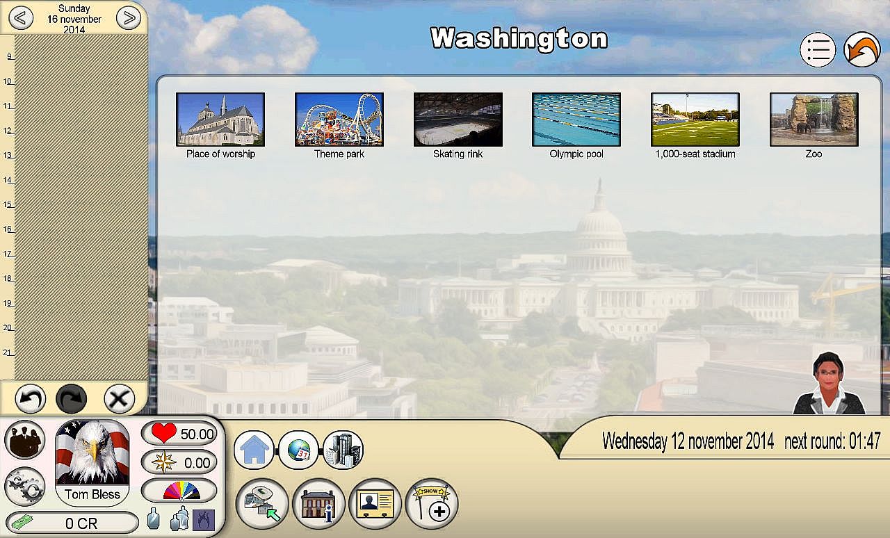 The game unfolds at the same pace as the real world. Each day, players can take action in the game to plan their travel, manage their budgets, establish contacts and develop their network, make statements, write articles, and create events.