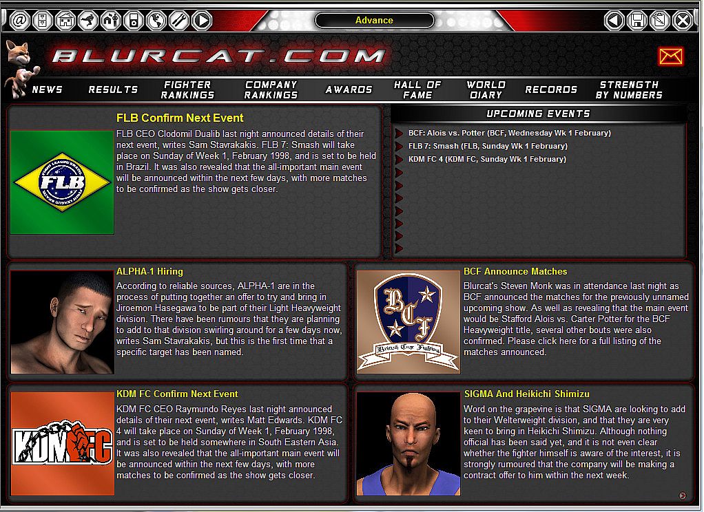 - In-game web site keeps you up to date on all the happenings and fighter rankings around the game world. Automatic archiving keeps track of the details for every fight.