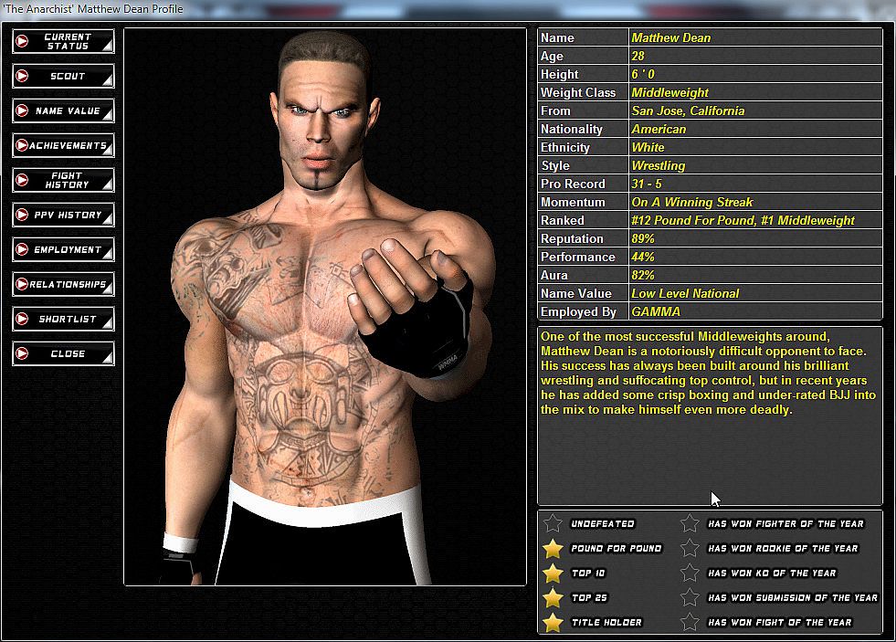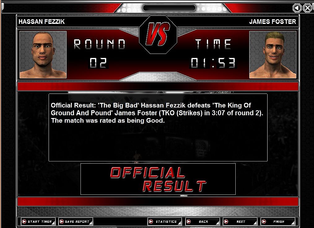 - Highly detailed fighters, with a multitude of statistics covering all major elements of MMA, from striking to jiu jitsu.