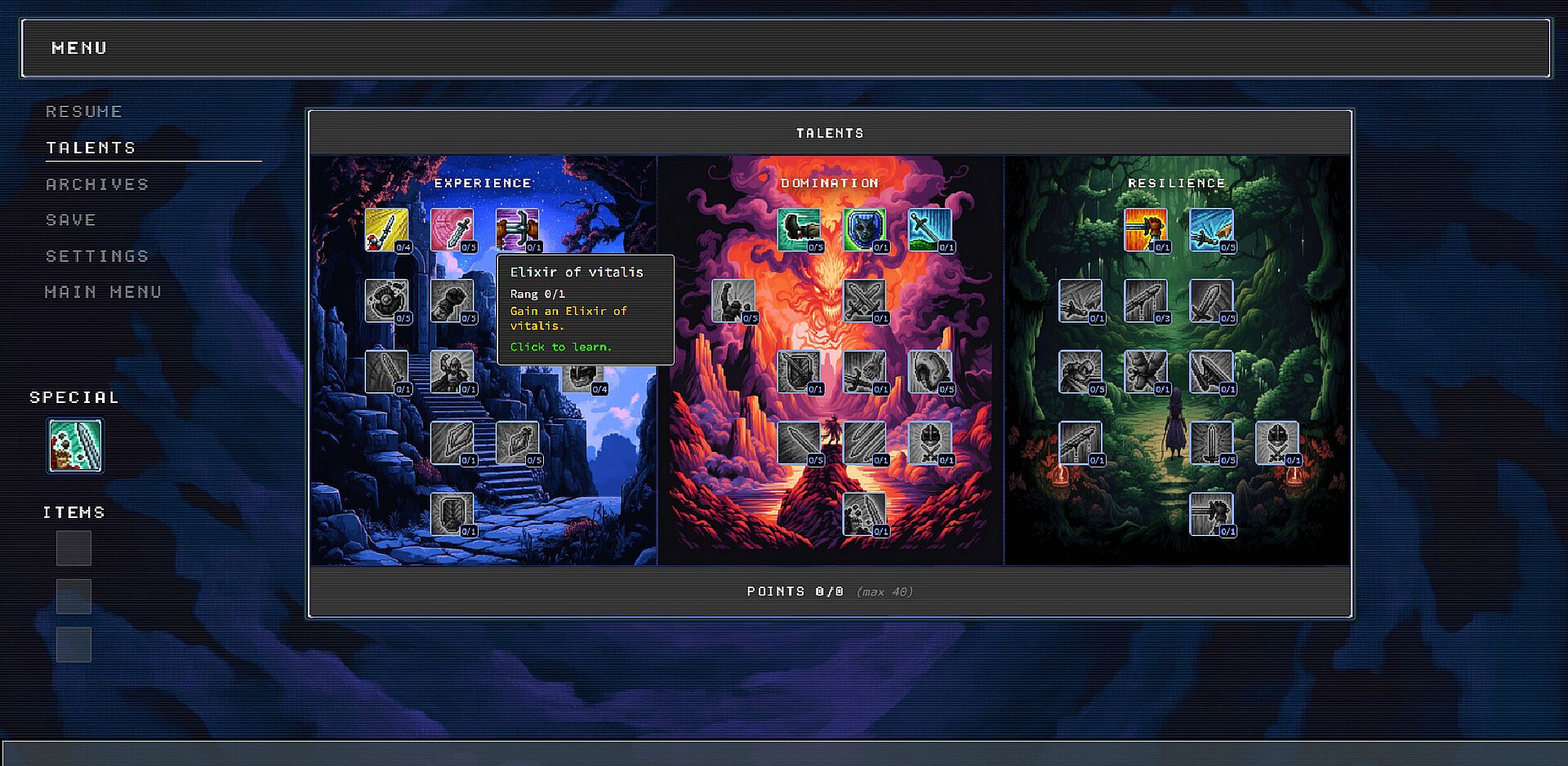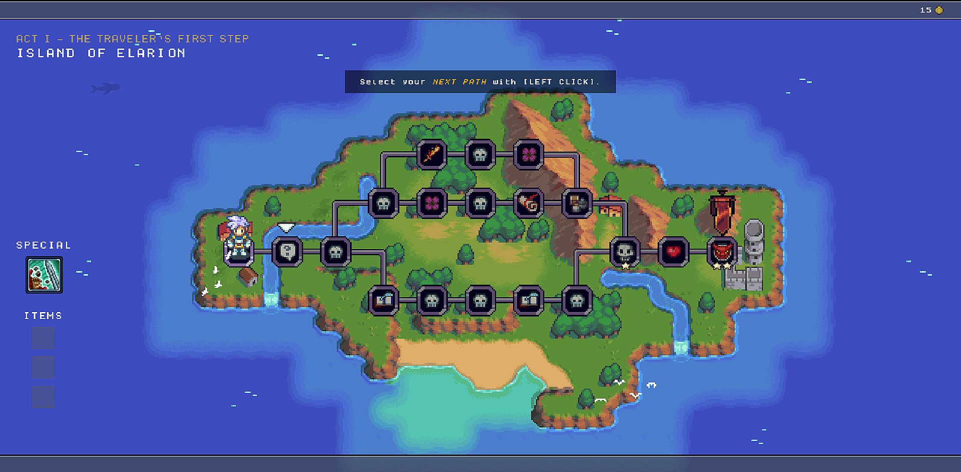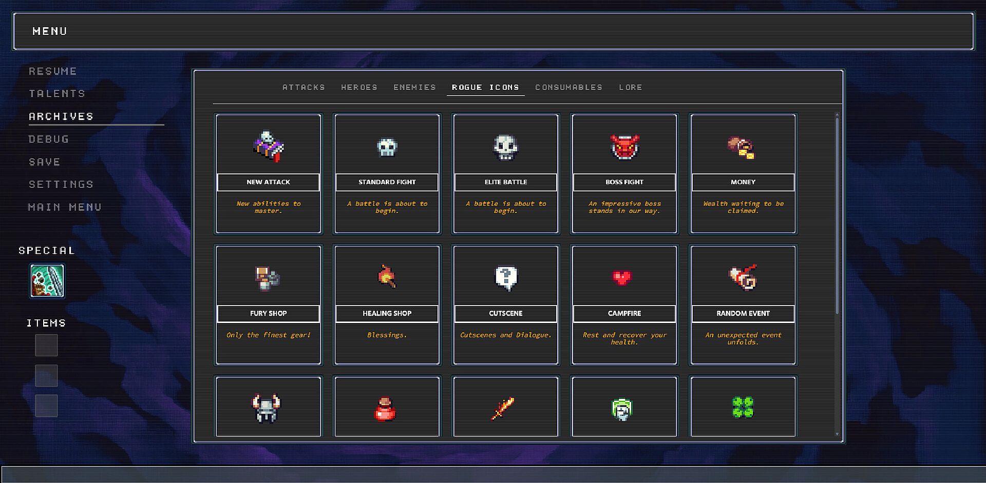 Explore a branching map and choose your path from 30+ events: battles, new attacks, shops, upgrades, equipment, or mini-games. Progress through 4 chapters of fights, minibosses, and unique bosses. Each run lets you improve, discover strategies, and earn tokens to unlock new power for the next journey.