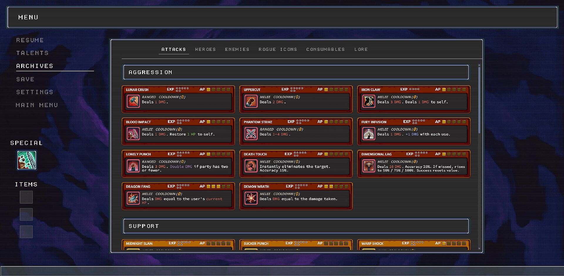 Combat uses an action point system (AP): some attacks consume AP, while others regenerate it. Certain abilities have cooldowns, forcing players to manage resources and timing. Here, it’s not your heroes who level up—it’s their attacks. Each one gains experience and can evolve through different upgrade paths, letting you shape unique builds and strategies.