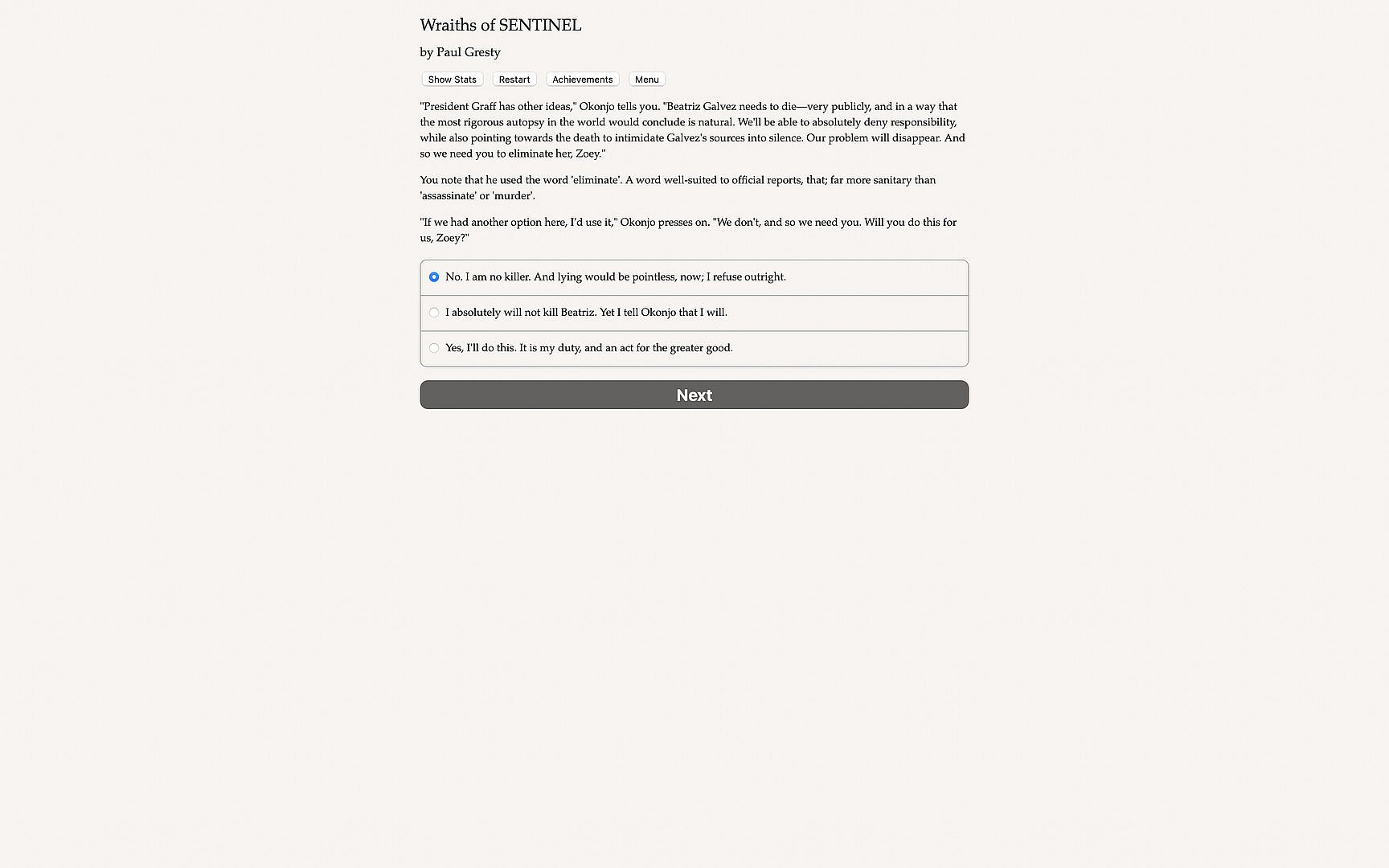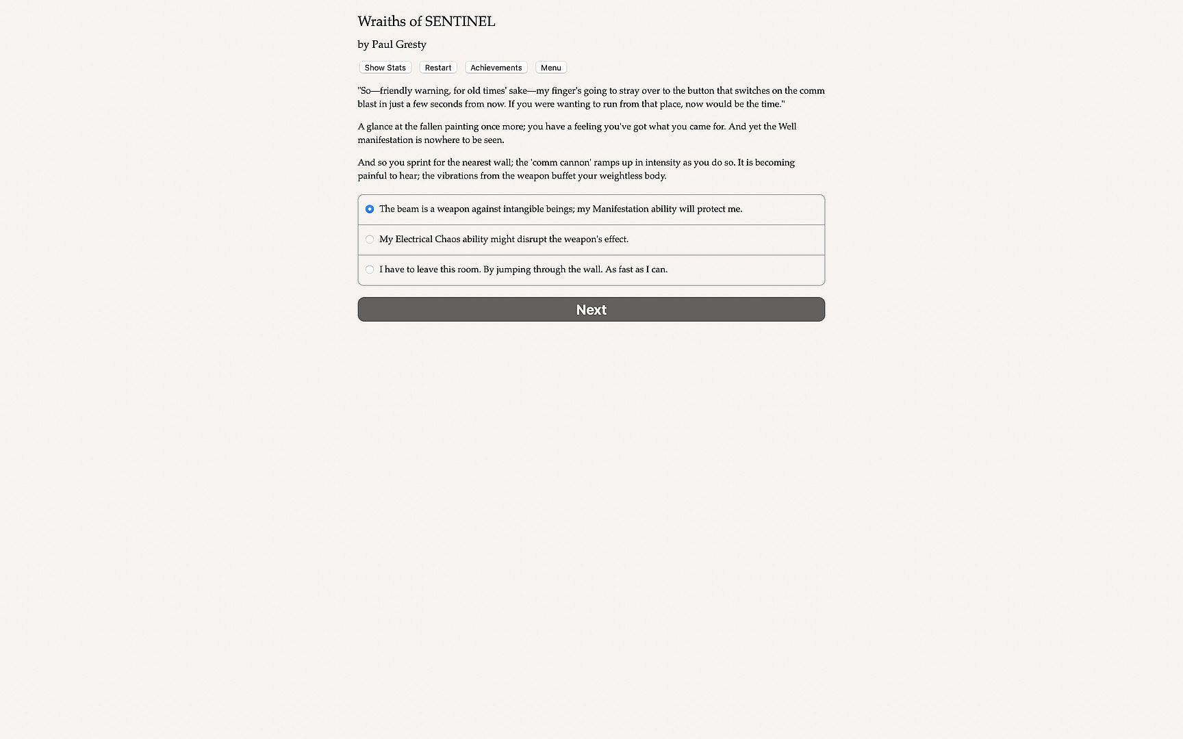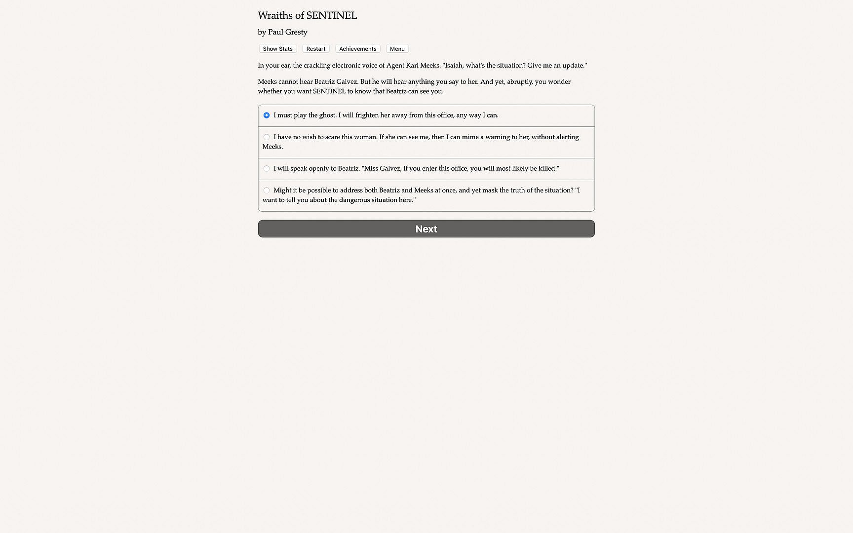 Wraiths of SENTINEL is a 250,000-word interactive novel by Paul Gresty where your choices control the story. It's entirely text-based—without graphics or sound effects—and fueled by the vast, unstoppable power of your imagination.