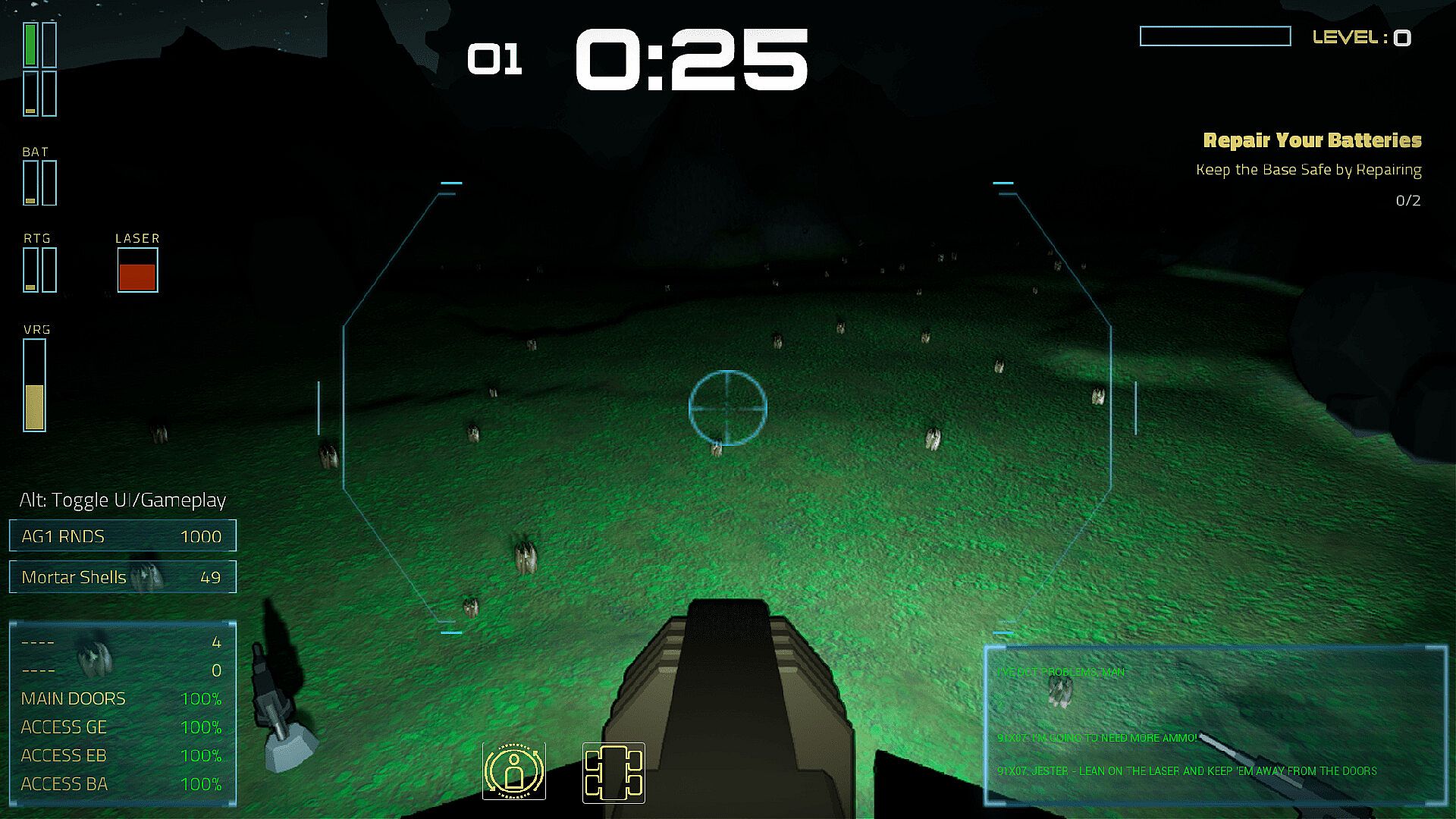 When night falls, the aliens emerge and swarm your turret.  Face them head on and try to survive another day.  You are the colony's only hope!