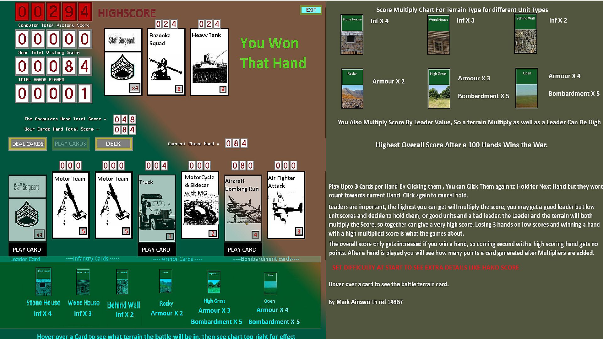 The Score board shows past games, and a high score is displayed while playing to compete against, its truly addictive to try and beat the high score. The game has other themes like frogs crossing a road, and invading aliens, as well as Mars. so get ready for a keyboard only shoot'em up