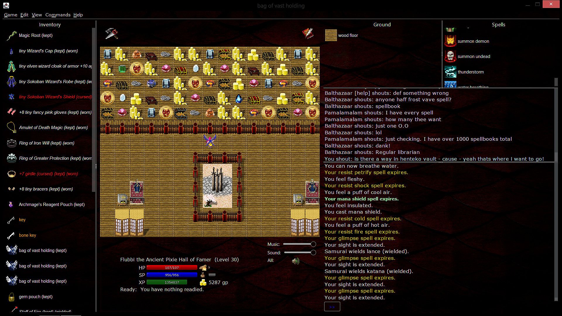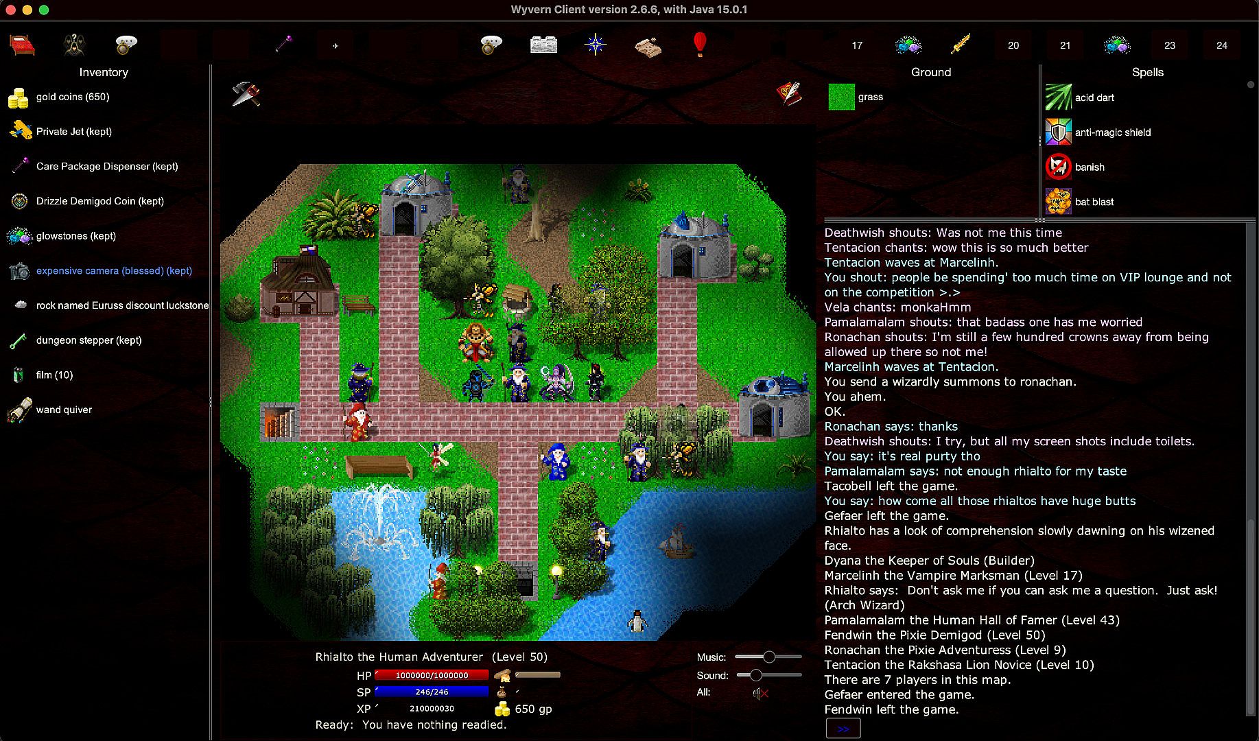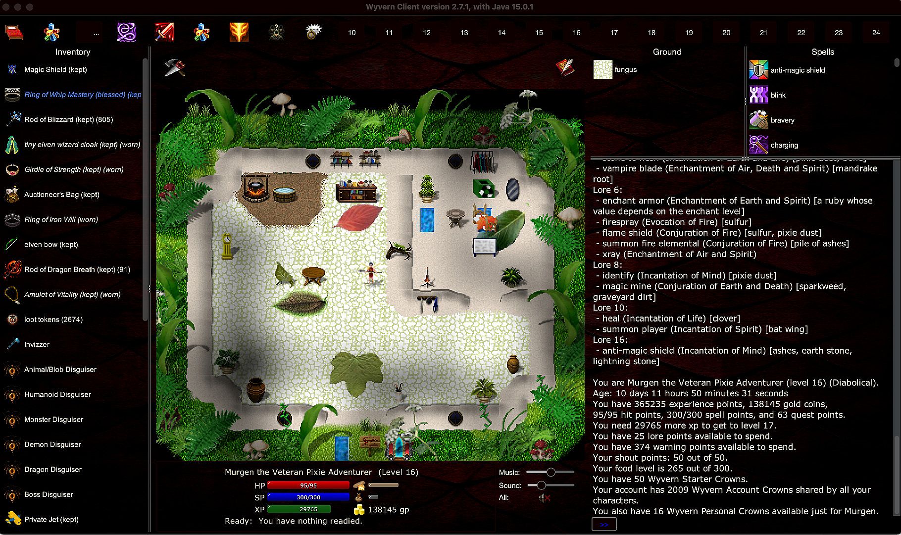 An important part of the gameplay is the text output area, on the right. The game tells you in text what's happening, and you can also see chat messages and other information there. The game window also includes views of your spells, your inventory, your stats, custom views for other situations.