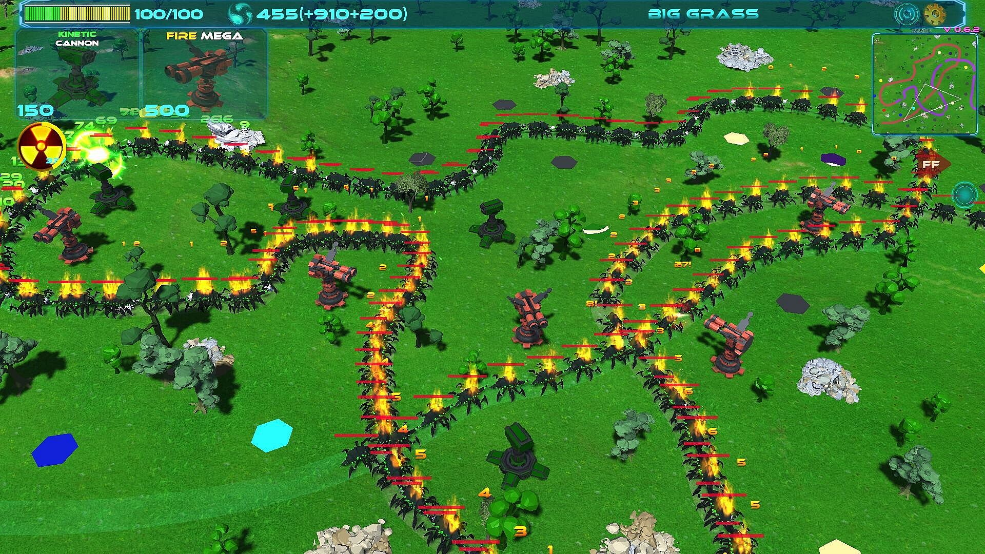 Ten different types of towers - long-range/short-range, AOE or single target, shoot slowly or quickly. You choose your arsenal. There are also five types of damage - physical, fire, frost, poison, and lightning - with different effects.  Frost slows enemies, fire burns, etc.