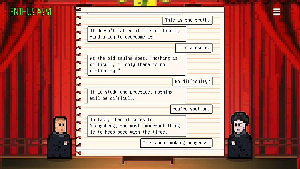 "Xiangsheng Simulator" is a humorous and witty adventure that takes you into the unique world of Xiangsheng. As a Xiangsheng Penggen, you'll team up with your Dougen partner to deliver a performance filled with laughter. make different dialogue choices, unleash a variety of hidden achievements through unique interactions. Your wit will shine on stage, and the synergy between you and your partner will become the source of laughter.