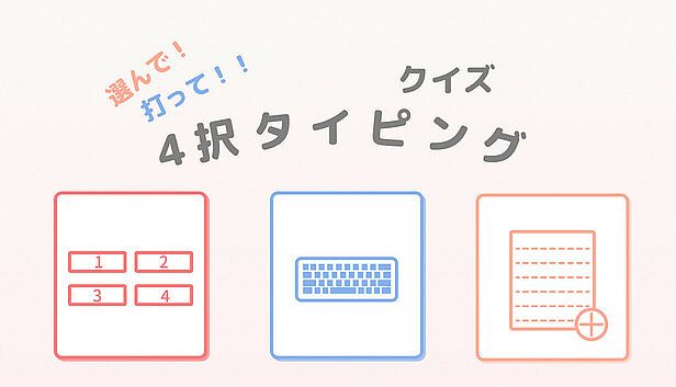 Before you start looking for a cheap 選んで!打って!!クイズ4択タイピング key, check the essentials. Developed by GlassLemon. Published by GlassLemon. PC released date: 07 Feb 2025. Genres: Indie, Casual. Categories: Multi-player, PvP, Online PvP, Family Sharing, Single-player, Steam Achievements.