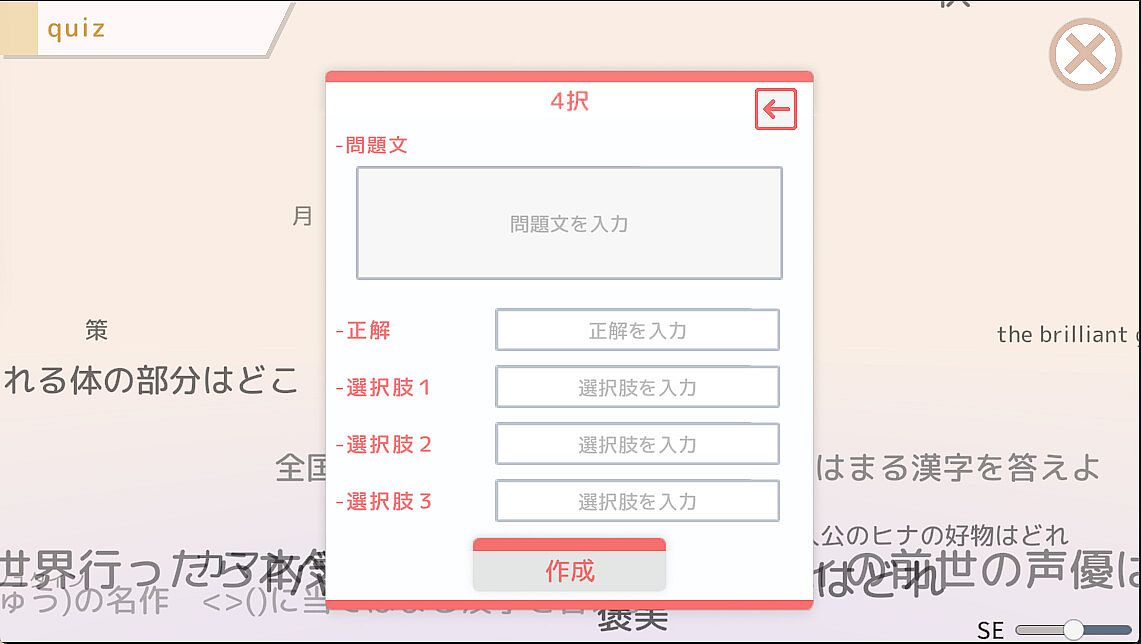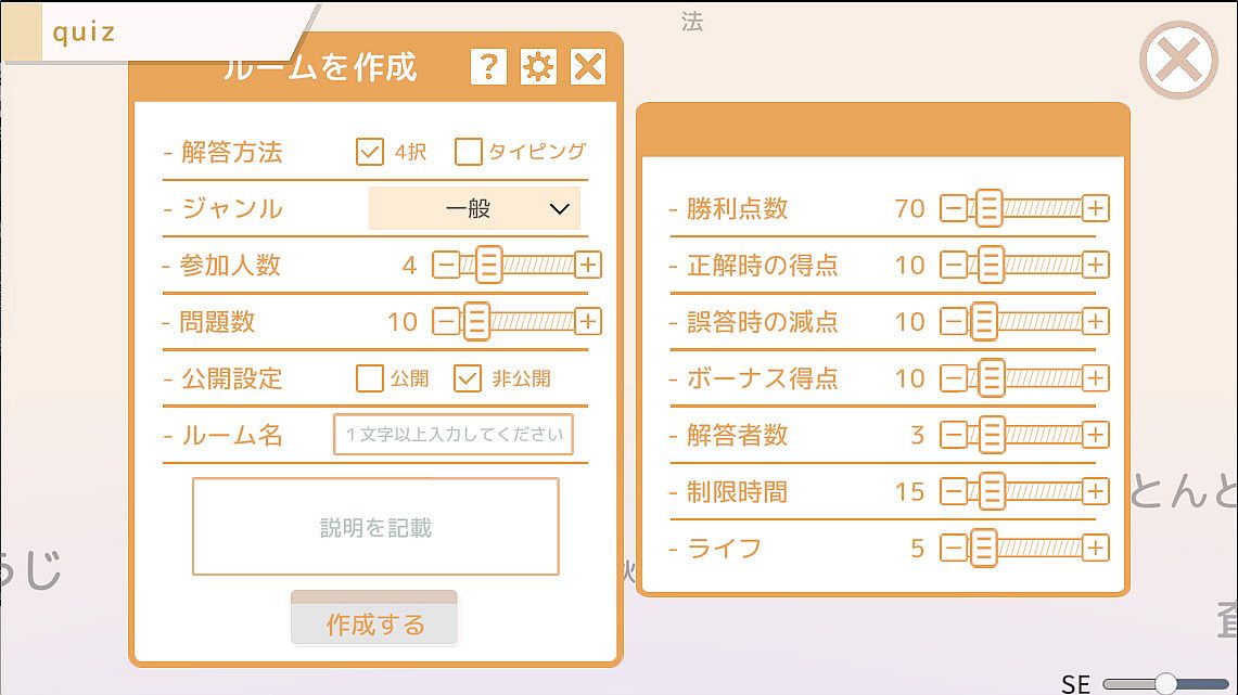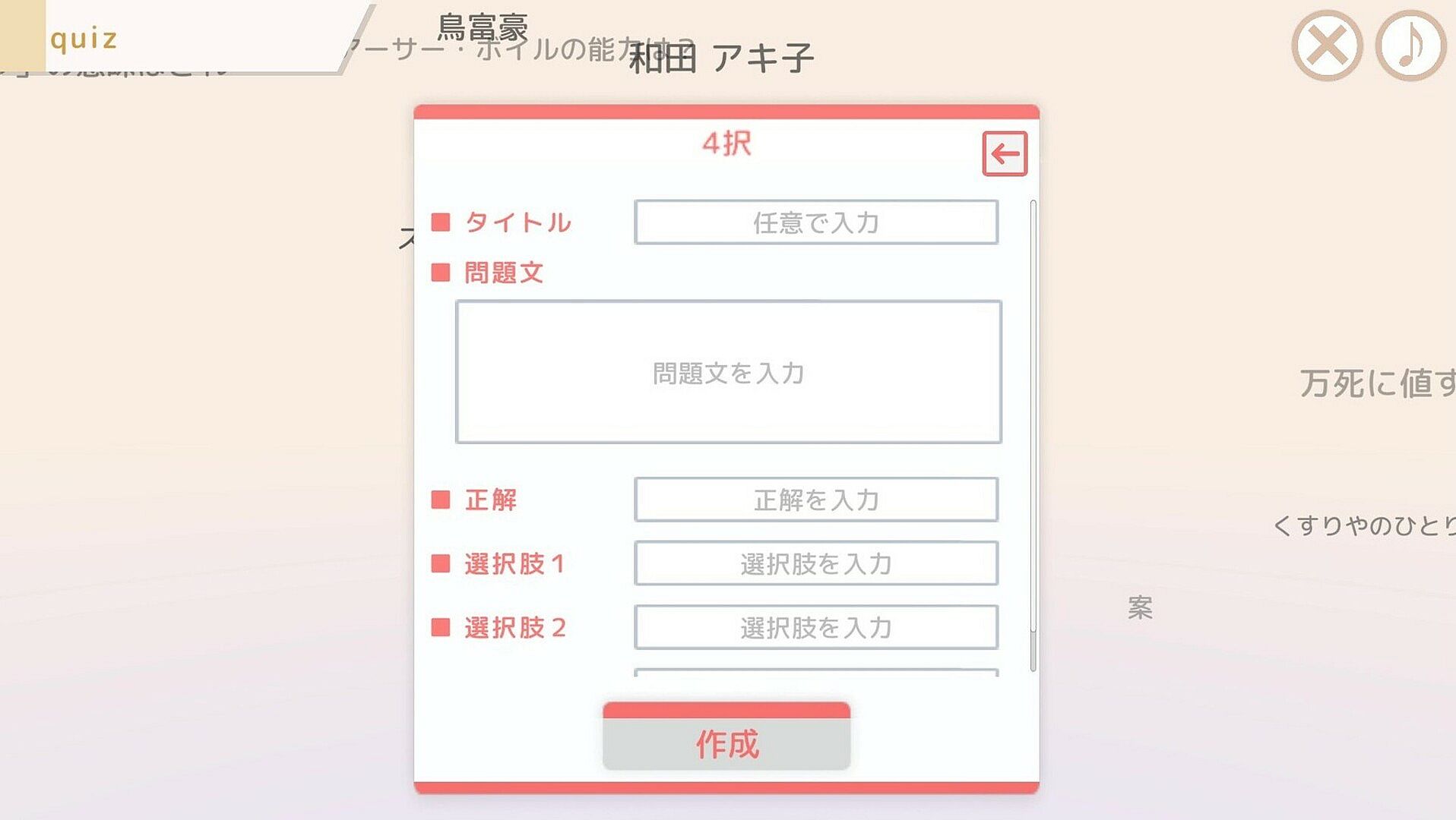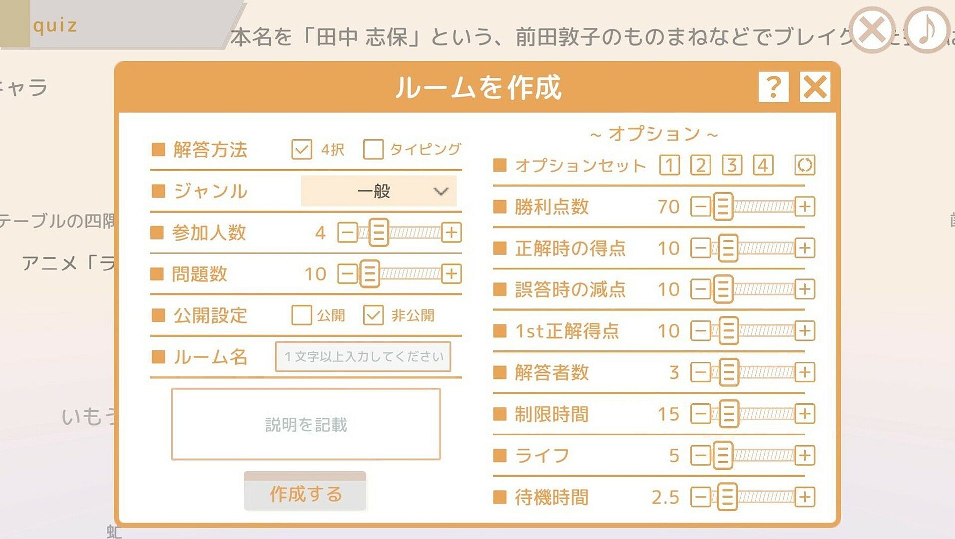 4択、タイピングそれぞれ自分で問題を作ることが可能!作った問題はルームマッチで使うことができるので、たくさんの問題を作っていろんな人と対戦しよう。