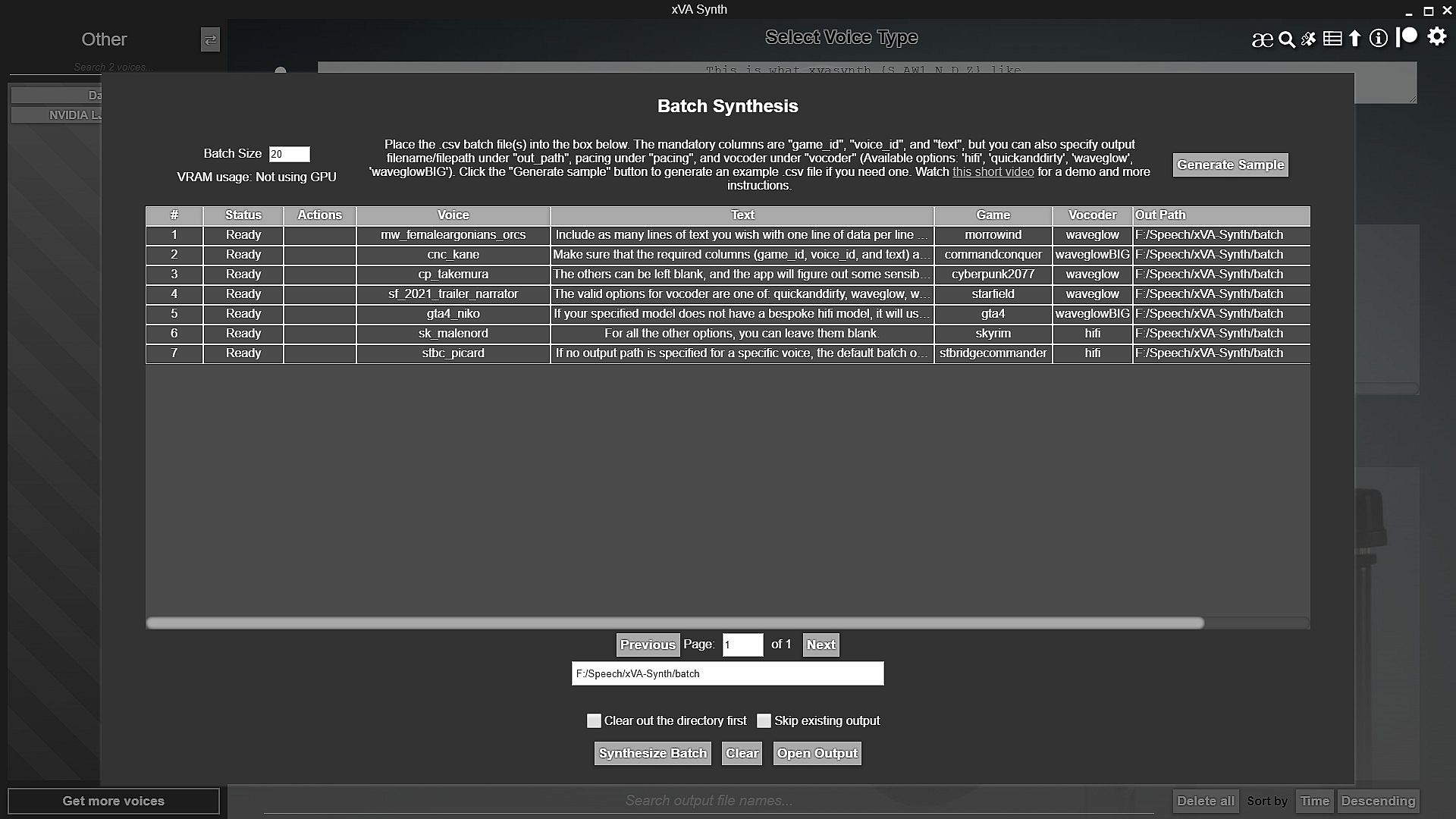 For larger projects, where you need to synthesize a large amount of lines, you can alternatively use the Batch synthesis mode. You can use either a .txt file or a .csv file to batch generate hundreds or even thousands of lines, in one go, with parallelization. Although the pitch/duration/energy editor is sometimes needed to get a line sounding just right, it's sometimes not needed, and this is a good way to get an initial pass on lines. Using the GPU is especially highly recommended for this, as you can greatly parallelize the number of lines generated in one go (limited by VRAM). You should also check the various settings, such as multi-threading, to get the best possible speed out of this for your system.