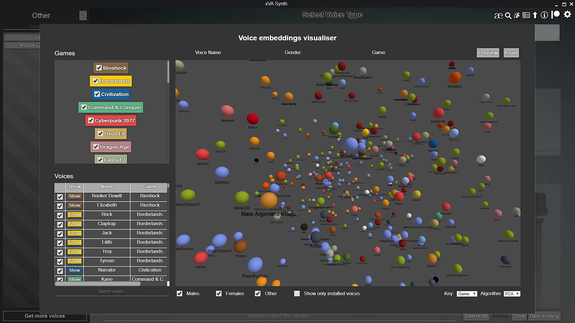 The 3D voice embeddings visualizer is an interactive panel where you can explore in 3D all the voices in the app, as seen by an AI representation learning model, projected down to 3D. There are no axes, and this serves purely as a visualization, to enable voice discovery. You can colour the points by game, or gender, and you can enable disable specific games/voices. You can load a voice by clicking it and the "Load" button, if it's installed.