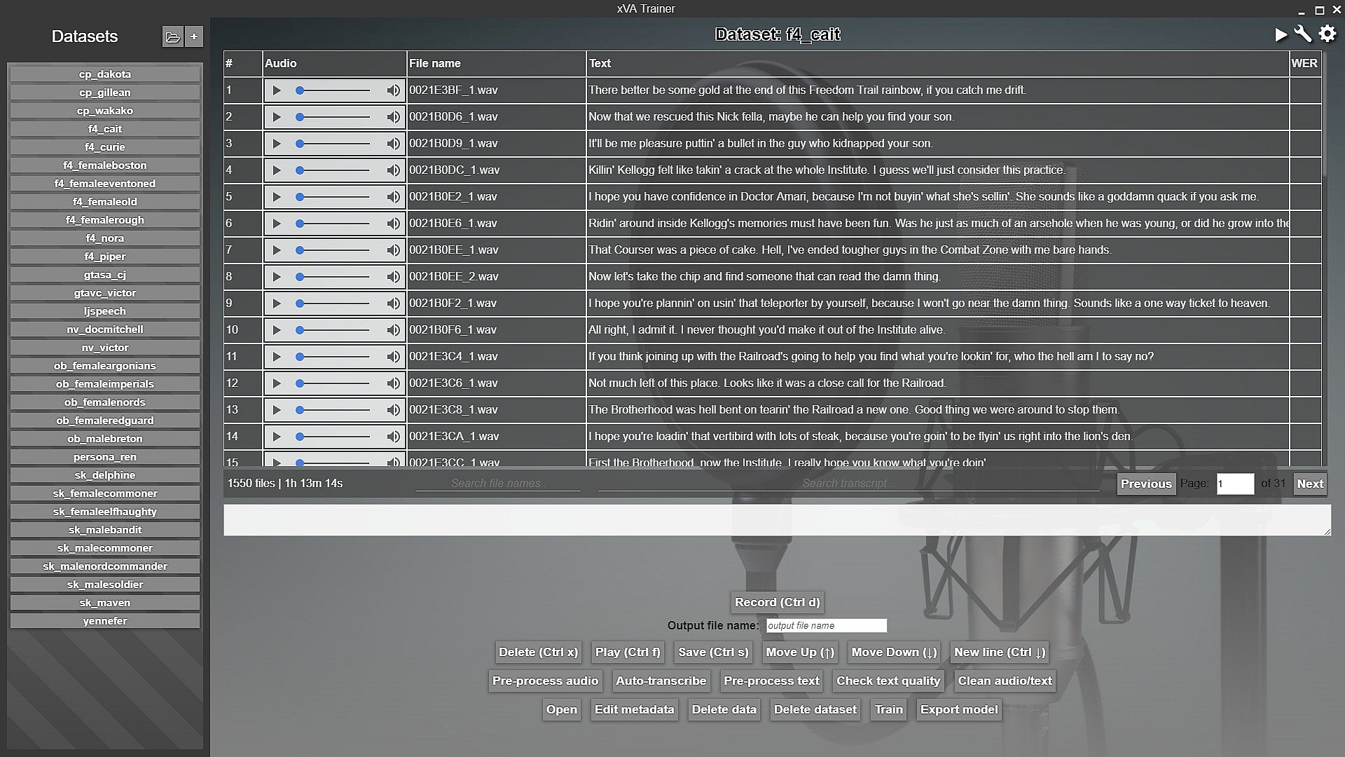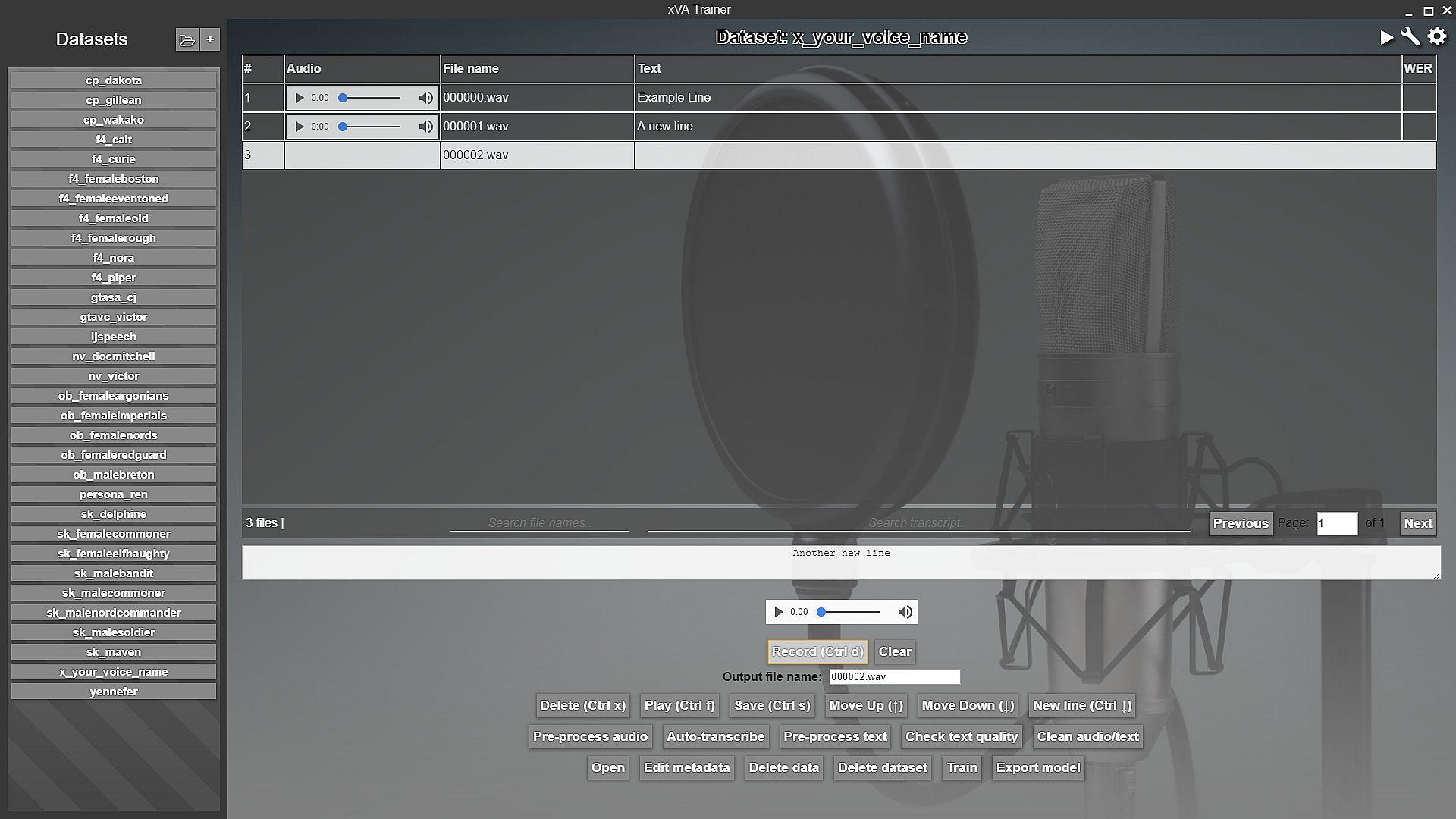 The main screen of xVATrainer contains a dataset explorer, which gives you an easy way to view, analyze, and adjust the data samples in your dataset. It further provides recording capabilities, if you need to record a dataset of your own voice, straight through the app, into the correct format.