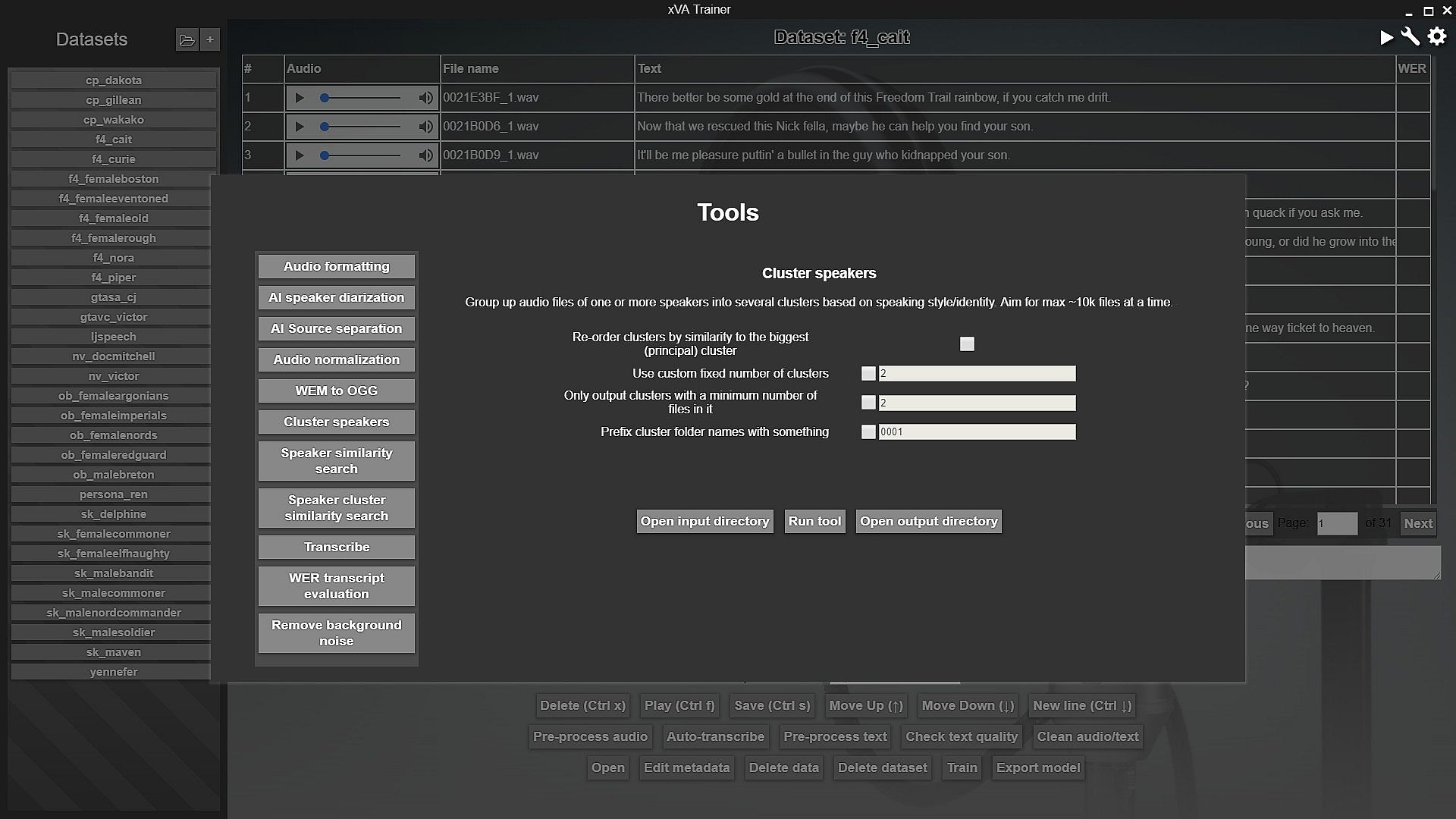 • Cluster speakers - a tool which uses an AI model to encode audio files, and then clusters them into a known or unknown number of clusters, either separating multiple speakers, or single-speaker audio styles