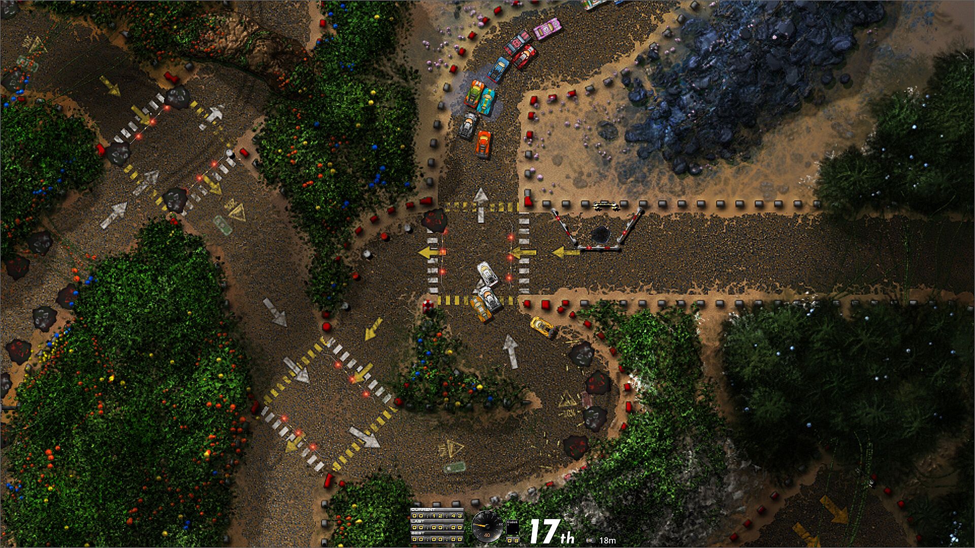 Wide dirt roads with exploding tyre walls (when struck).