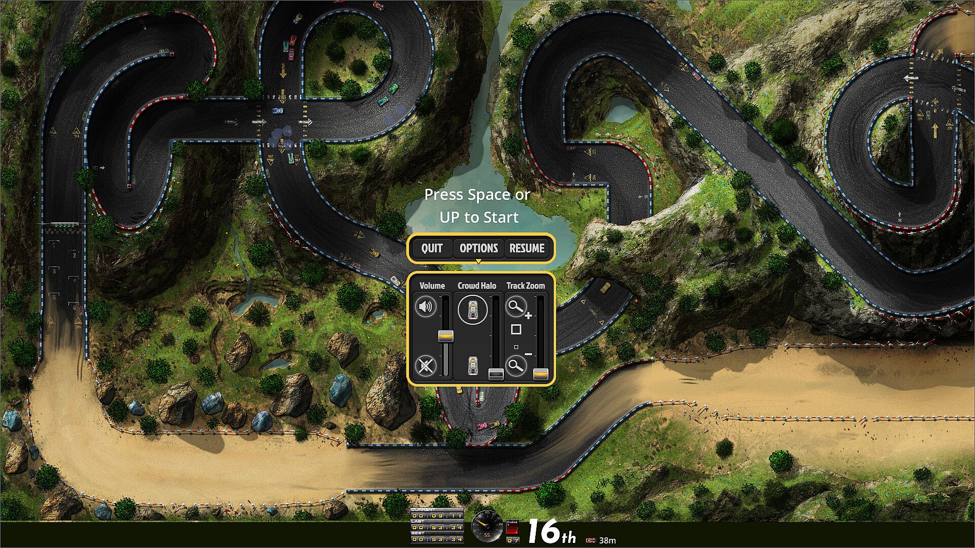 There are 3 levels of difficulty, and 8 tracks (New track added, Montezuma @ 17/06/2025) to play and unlock. Do note, Gold level will require all your nous, reflexes and ability to drive competently. Or, better yet, 'recklessly, aggressively stupid and diabolically evil'. Draw no quarter, win at any cost!