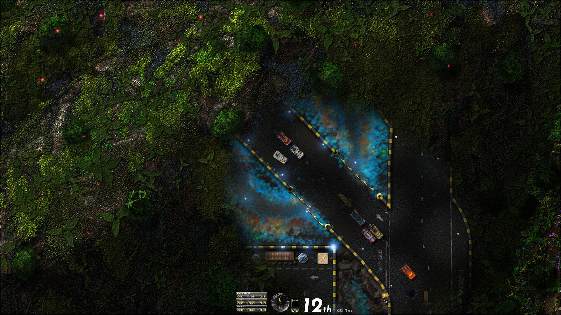 A reference to the Game: Supercars 1 & 2 on the Amiga, this could be considered a remake with more hand drawn, hand painted artwork with enhanced destructible environments and increased difficulty.