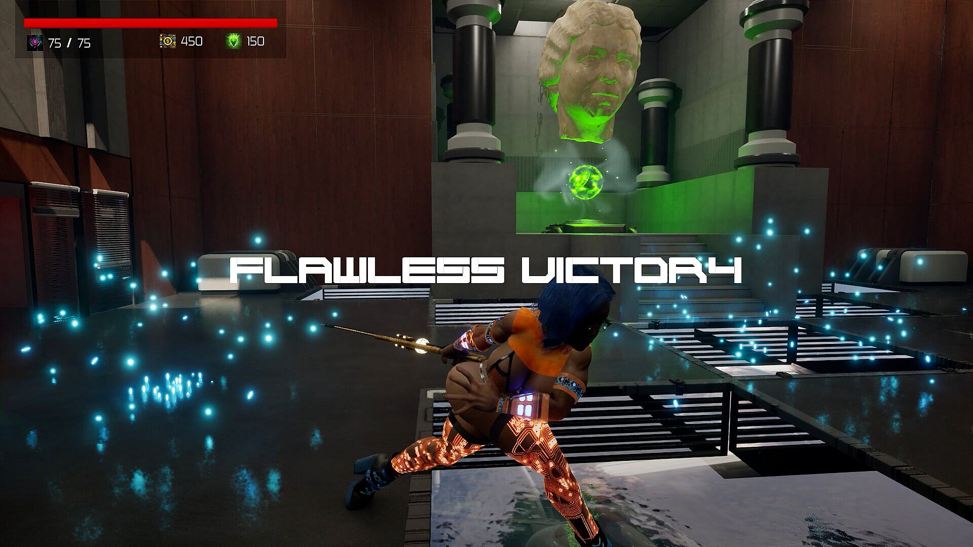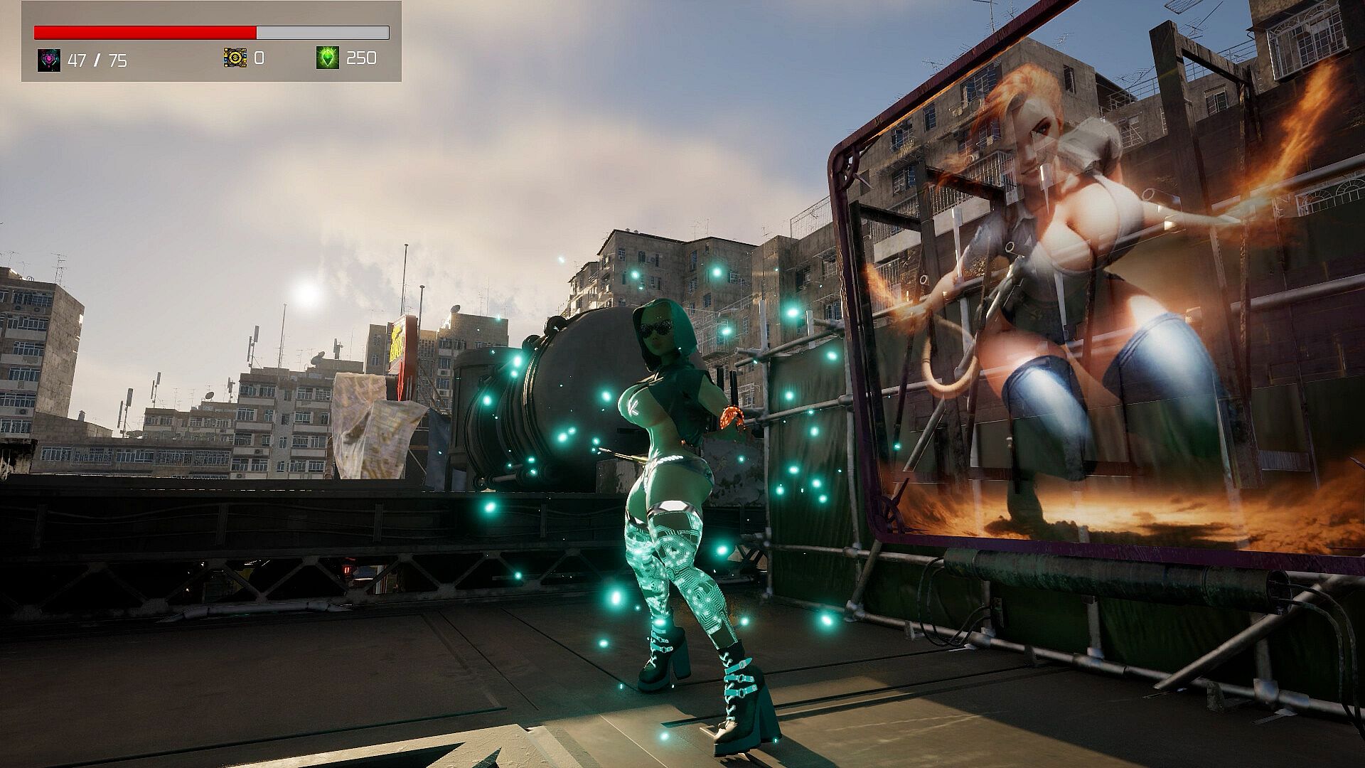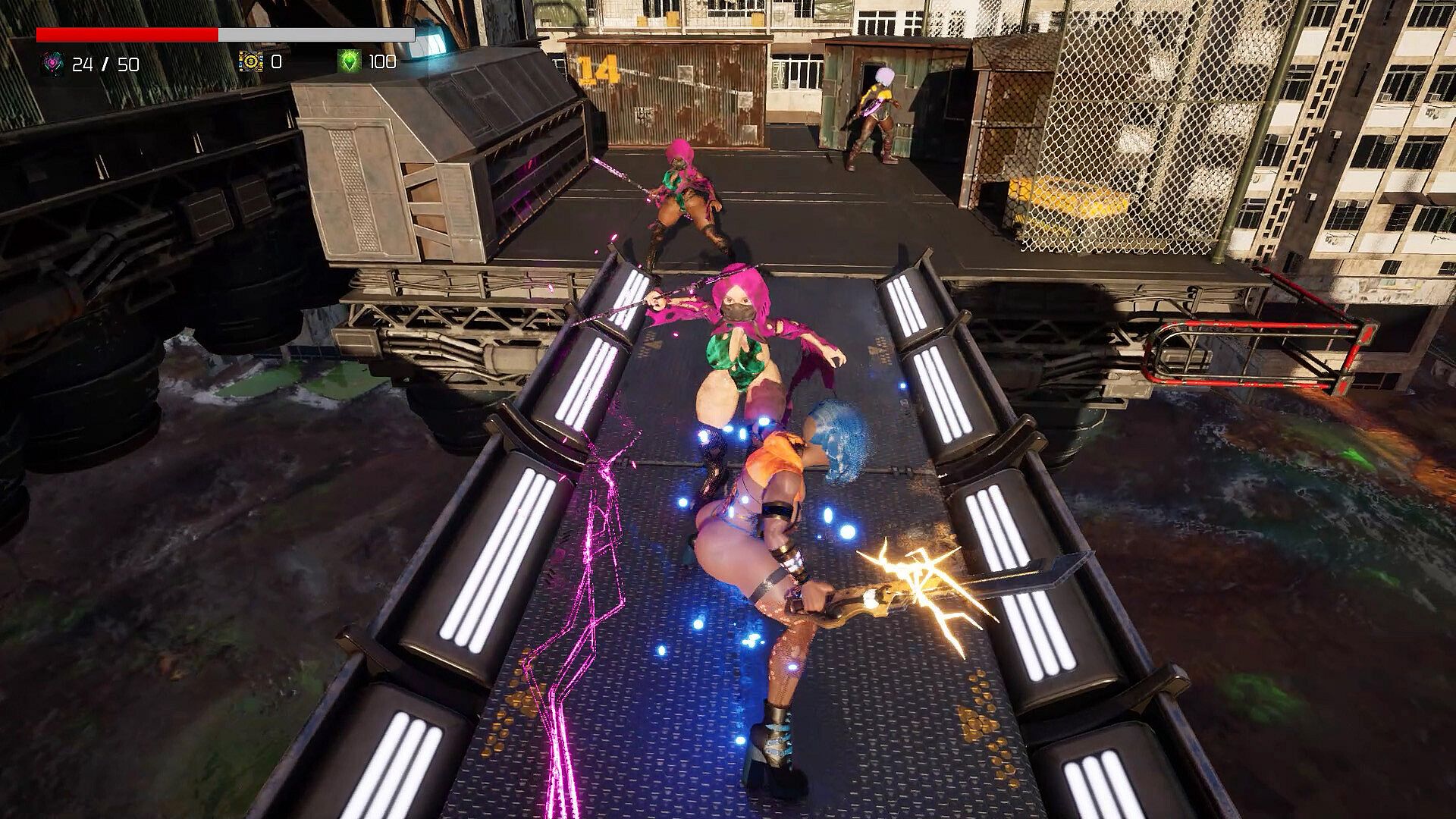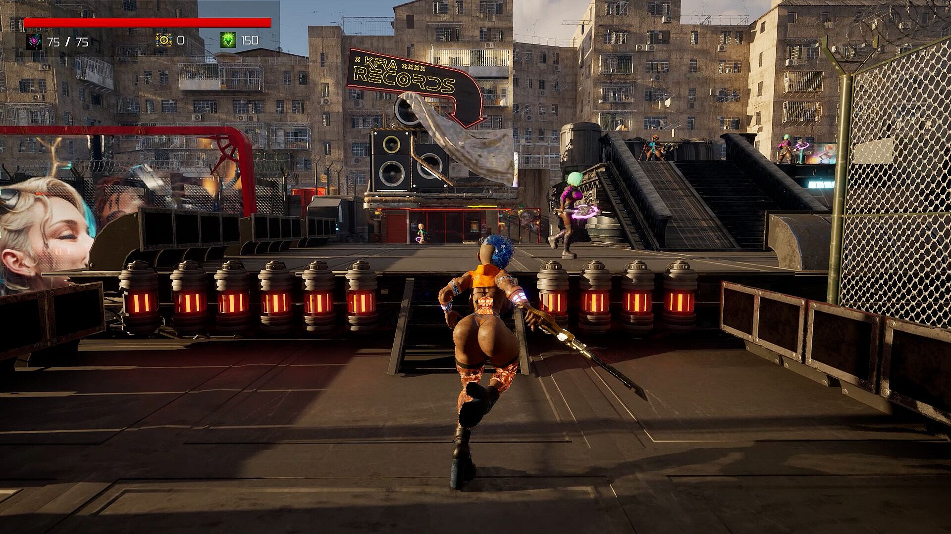 Hack'n'slash shenanigans ensue, with Velocity attacking, specialing, projectiling, dashing, and blocking her way through 15 punishing levels and bosses! Powers will be upgraded, health bars will grow, and wardrobe items of varying quality and dubious taste will be unlocked!