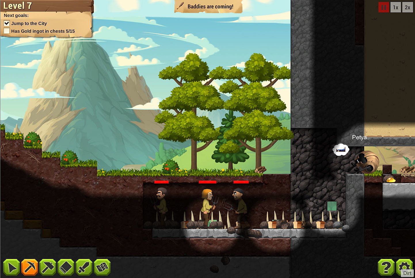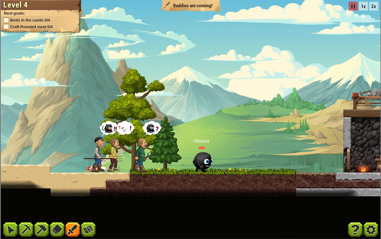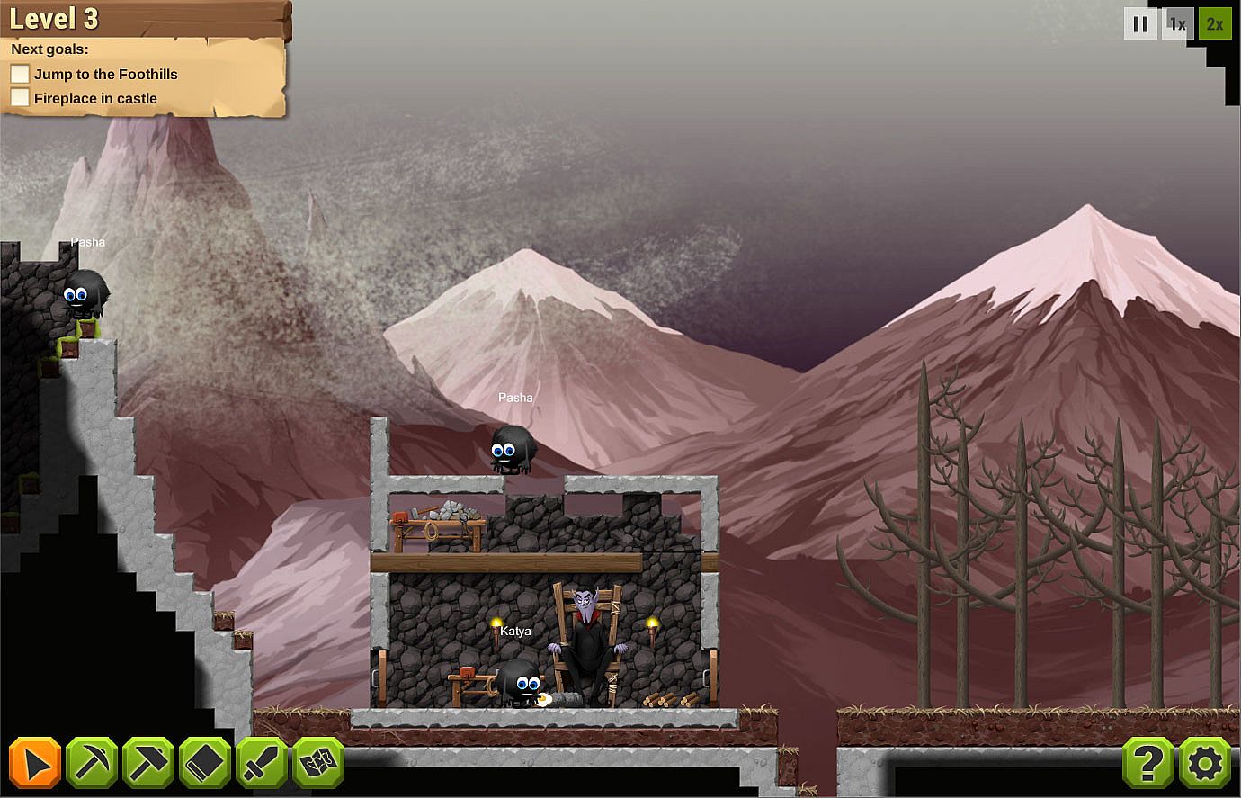 You have cute diligent servants to obey your orders. Manage them properly, they can mine, build fortifications, craft stuff for you.