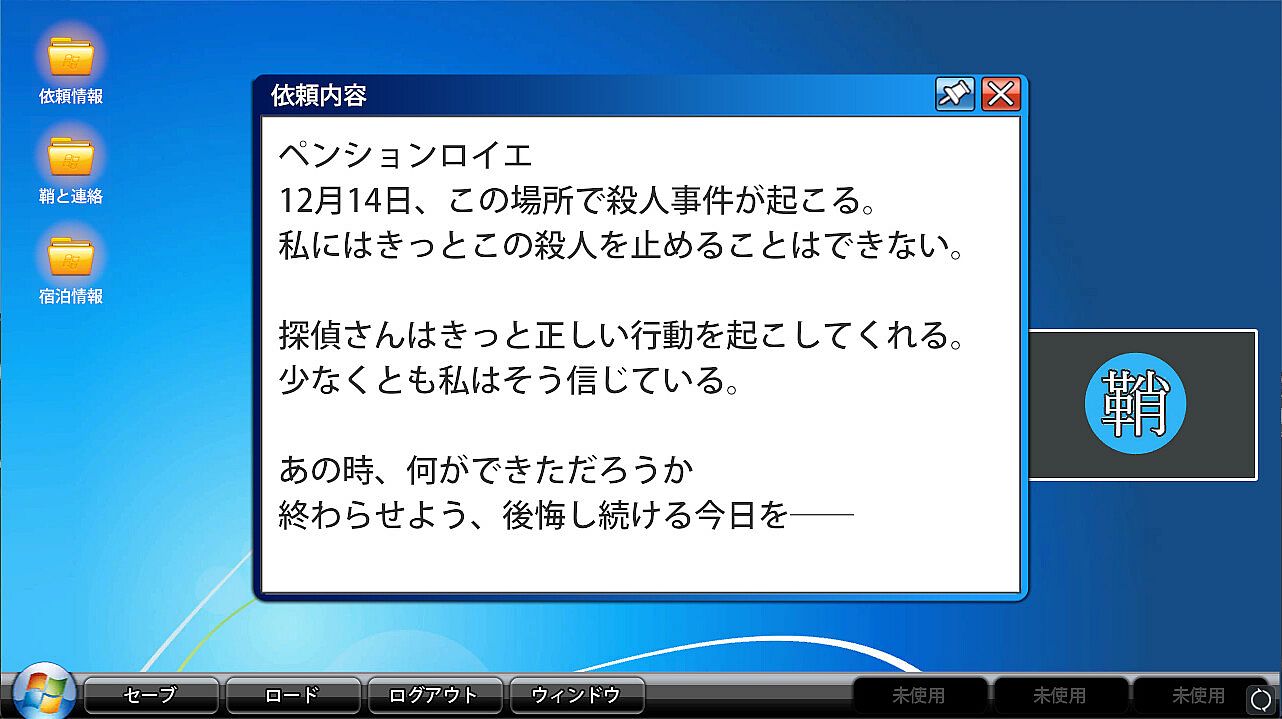 雪山ペンションで起こる殺人事件を阻止するため、聞き込みとパソコンで情報整理するマルチエンドミステリーADV『夜明けの影法師』