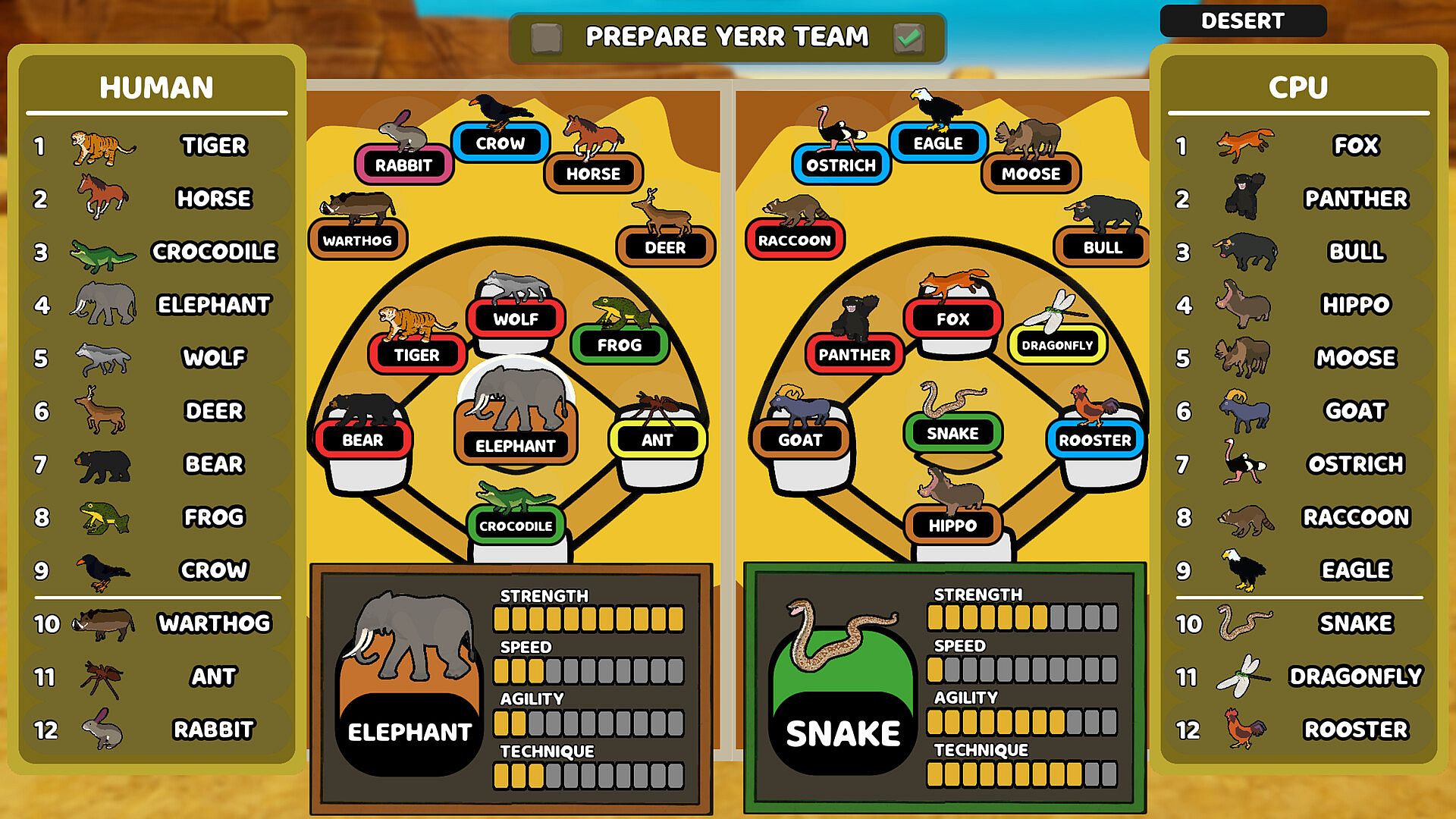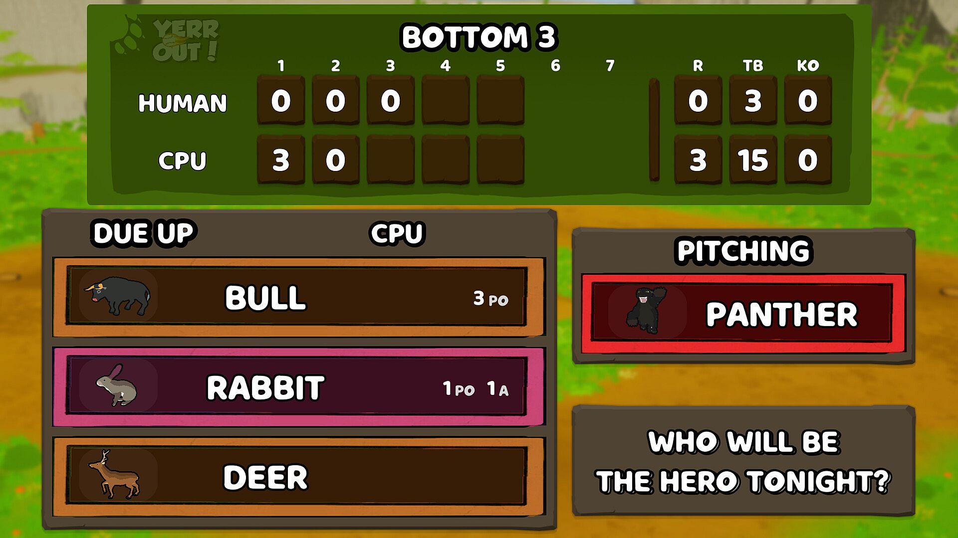 Inspired by the game of baseball, Yerr Out is a barnstormin' good time out on the ballfield. Choose from 30 different animals to assemble your team. Each character has different attributes which are categorized by STRENGTH, SPEED, AGILITY, TECHNIQUE