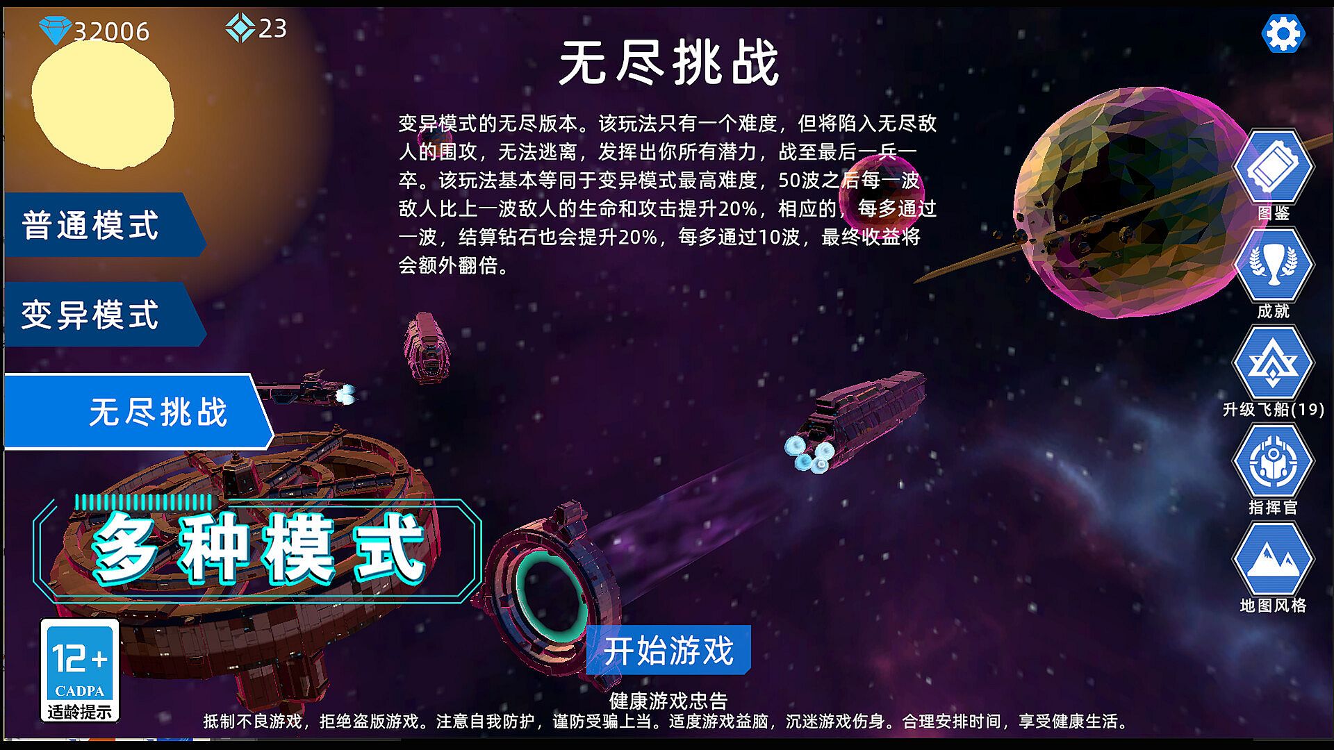游戏设置有普通模式,变异模式,无尽挑战三种模式。