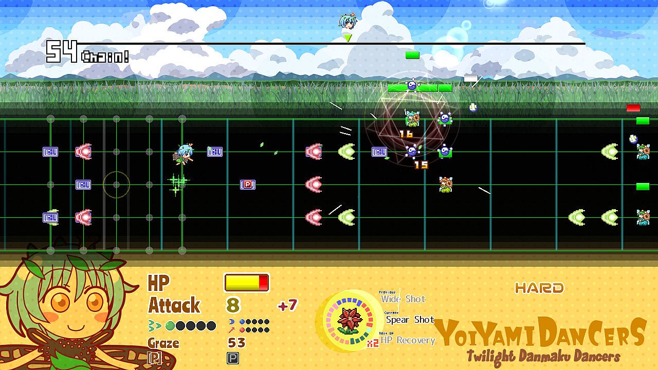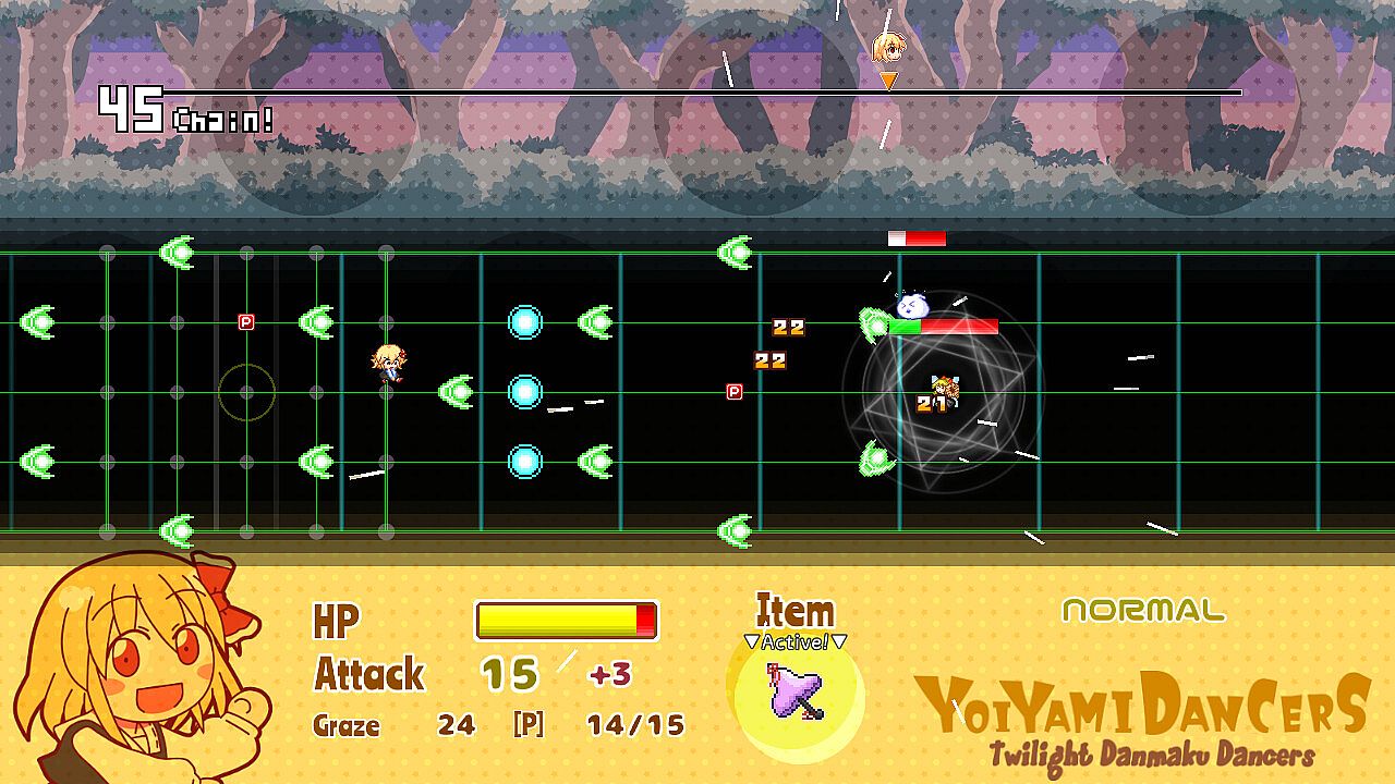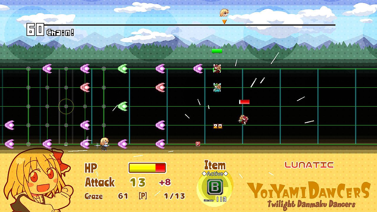 Dodge bullets to the beat and take down enemies in this danmaku rhythm action game. Players ride the rhythm with forgiving timing that accepts slight speed variations, while the protagonist dances across the bottom of the screen amid cute, colorful sprites. Four difficulties, infinite retries, and helpful items ensure smooth progress through boss encounters. Practice Mode lets you hone dodging against every main story boss for as long as needed. The light-hearted tale follows Rumia the Youkai of Twilight and Eternity Larva the Swallowtail Butterfly Fairy amid a fairy fad for danmaku dancing in Gensokyo. Beginners and experts alike find challenge and fun in the action.