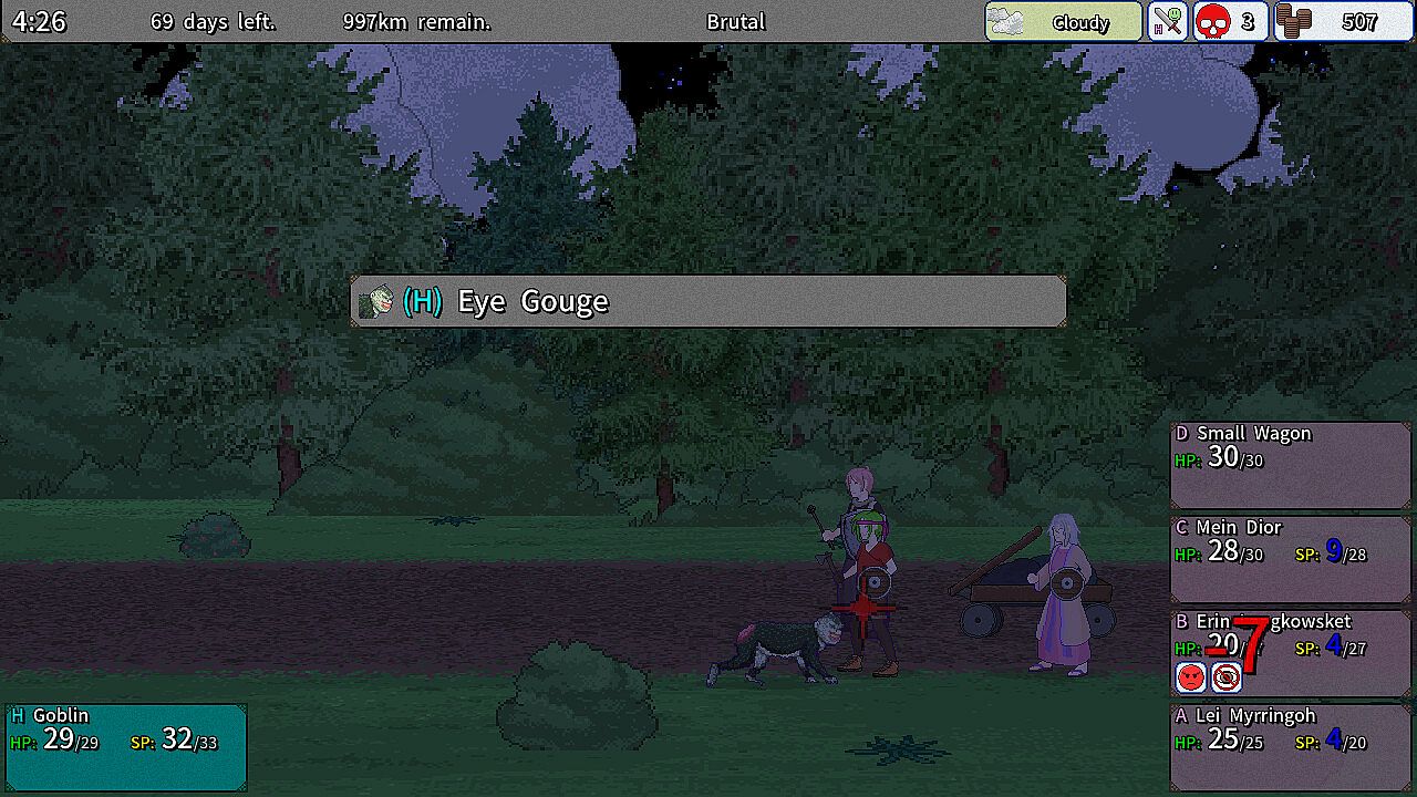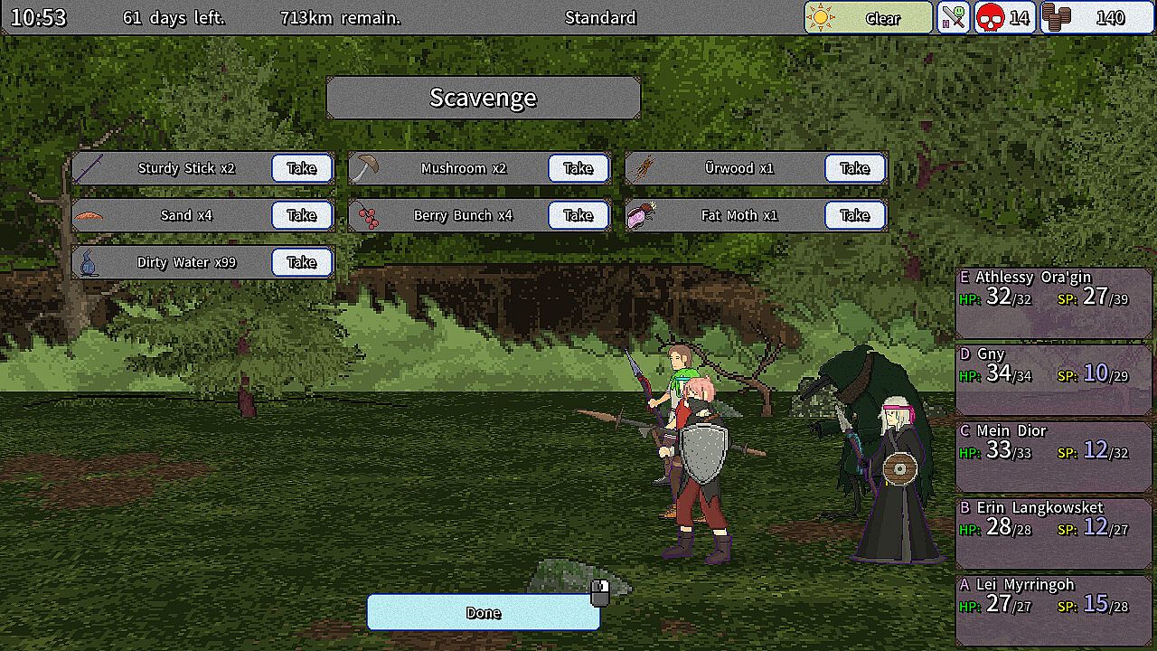 Yomp for Zhi is a difficult turn-based RPG about a journey across Holtoss (a region riddled with crime and dangerous creatures). The unlikely heroes have a limited amount of days to rescue people who are going to be killed (including the titular Zhi).