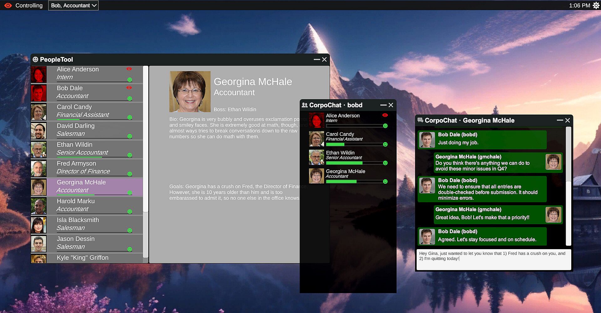Learn about Alice, her coworkers, and her company as you explore this open-world conversational sandbox that changes every time you play.