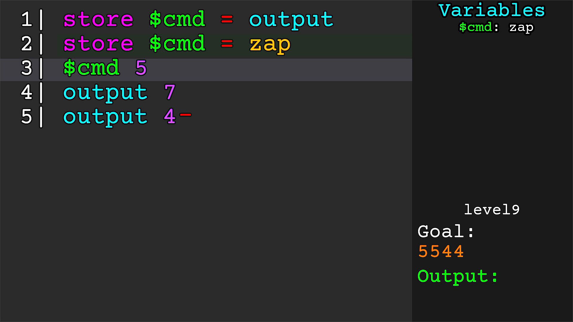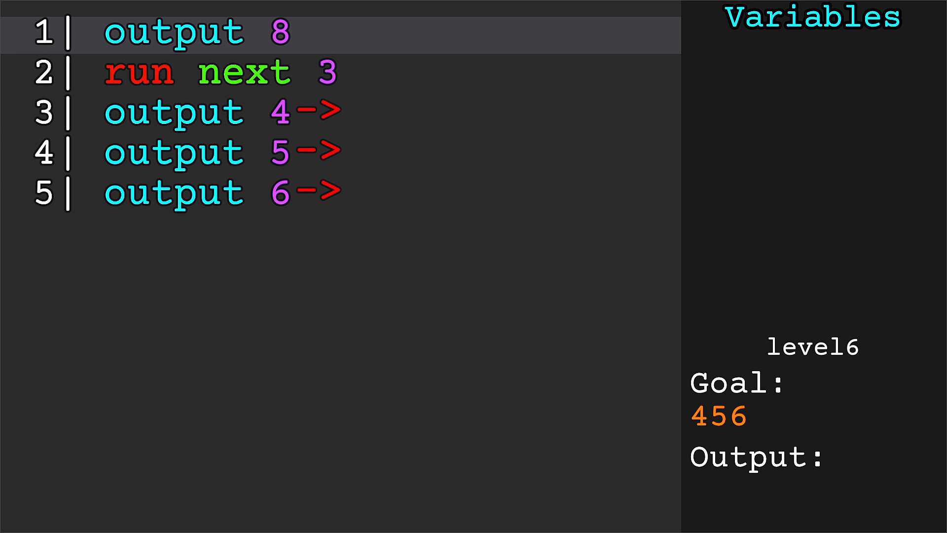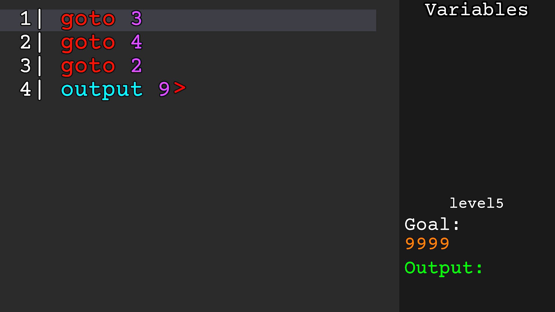 Programming puzzle game, but YOU CAN'T TYPE. Navigate and run pre-existing lines of code to make your output match the goal! Watch out for bugs eating away your code!