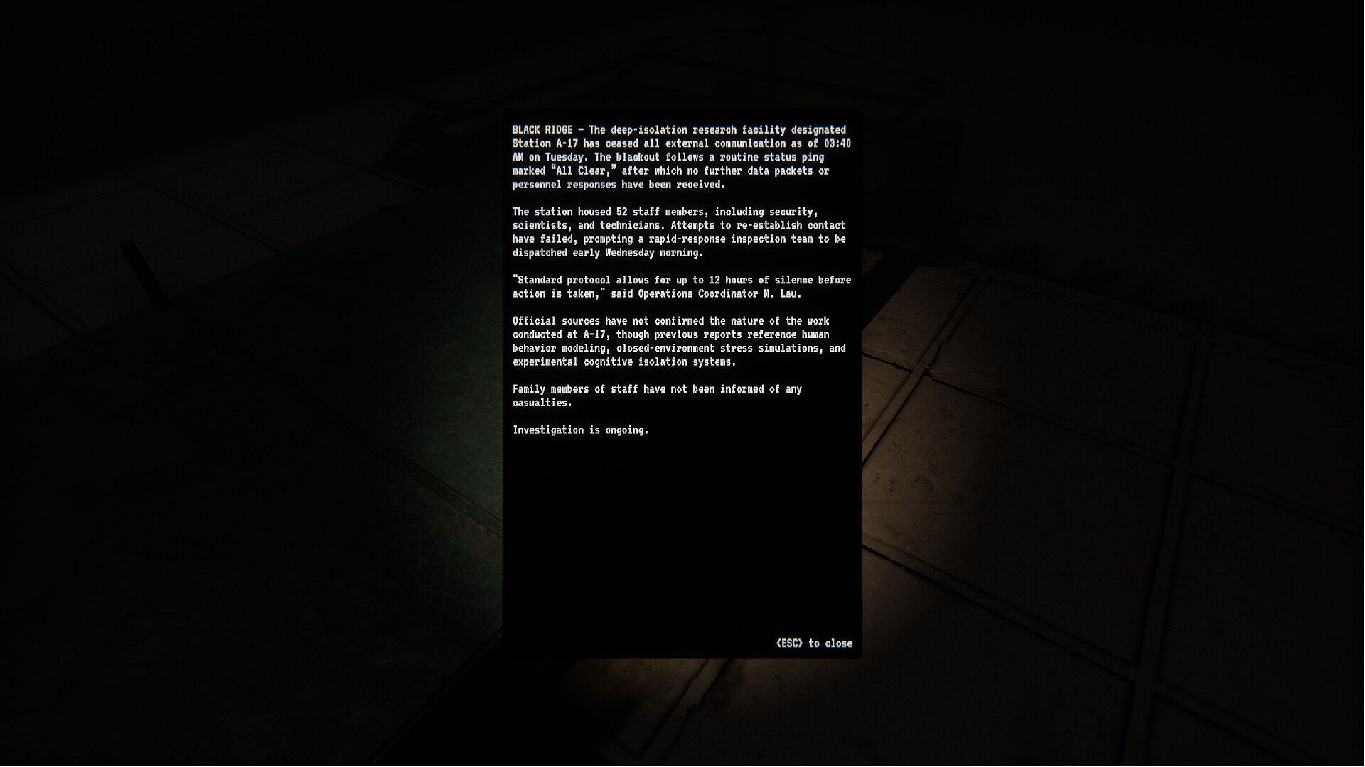 17 hours after the last transmission from Research Site E-17, you are sent to investigate.