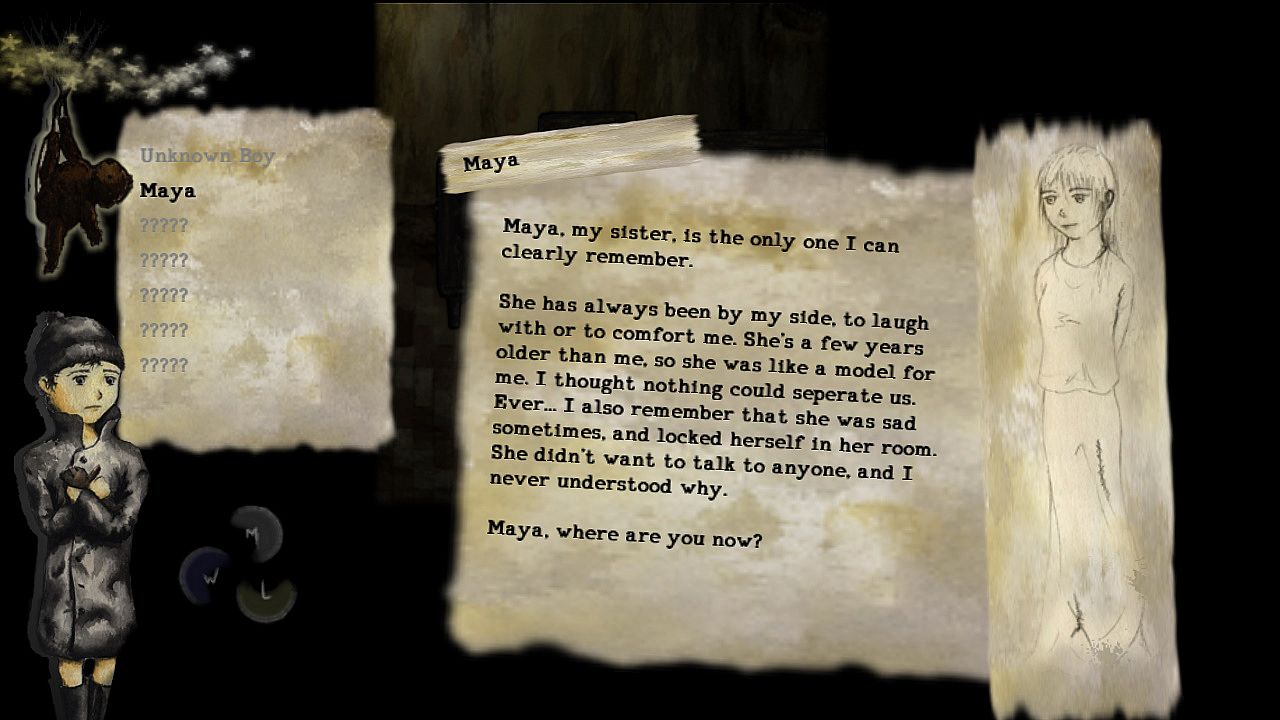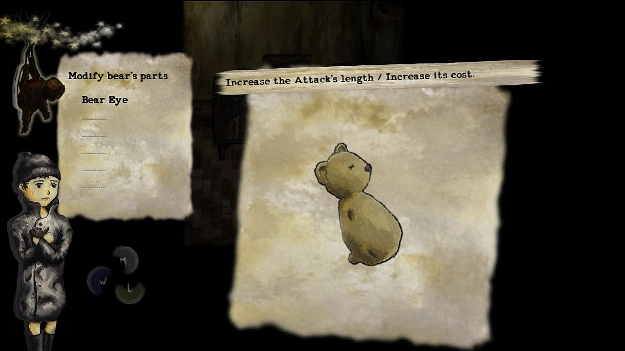 The boy possesses a resistance to madness (Mind) and a strength to fight the Shadows (Will). These characteristics can be improved by finding hidden items or missing pieces of the teddy bear.