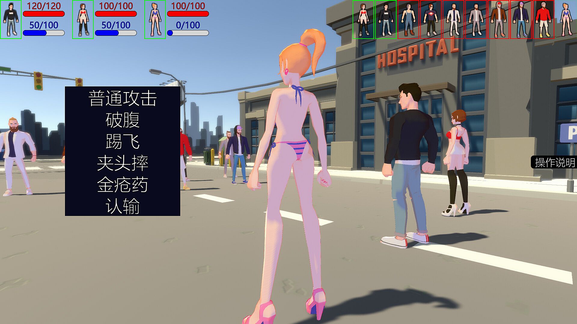 这是一个回合制动作游戏,画风为低多边形。开始,你需要操作一个角色和一个敌人战斗,随着剧情的发展,会有两个伙伴加入队伍,敌人的数量也会增加。你需要采取合适的攻击策略,对敌方角色造成尽可能多的伤害,同时,让我方角色尽量少受到伤害。你可以购买食物和药物,都可以用来恢复血量,不同的是,药物可以在战斗中使用,而食物不能。你的战斗策略越巧妙, 受到的伤害就越少,就能节省购买食物和药物的钱,并把这些钱用来购买天赋点数,用于加强自身的基础属性,强化战斗能力。游戏总共包括5个关卡,每个关卡包括3场战斗。通关后,男主会和一个年轻的御姐结婚,过上幸福的生活。