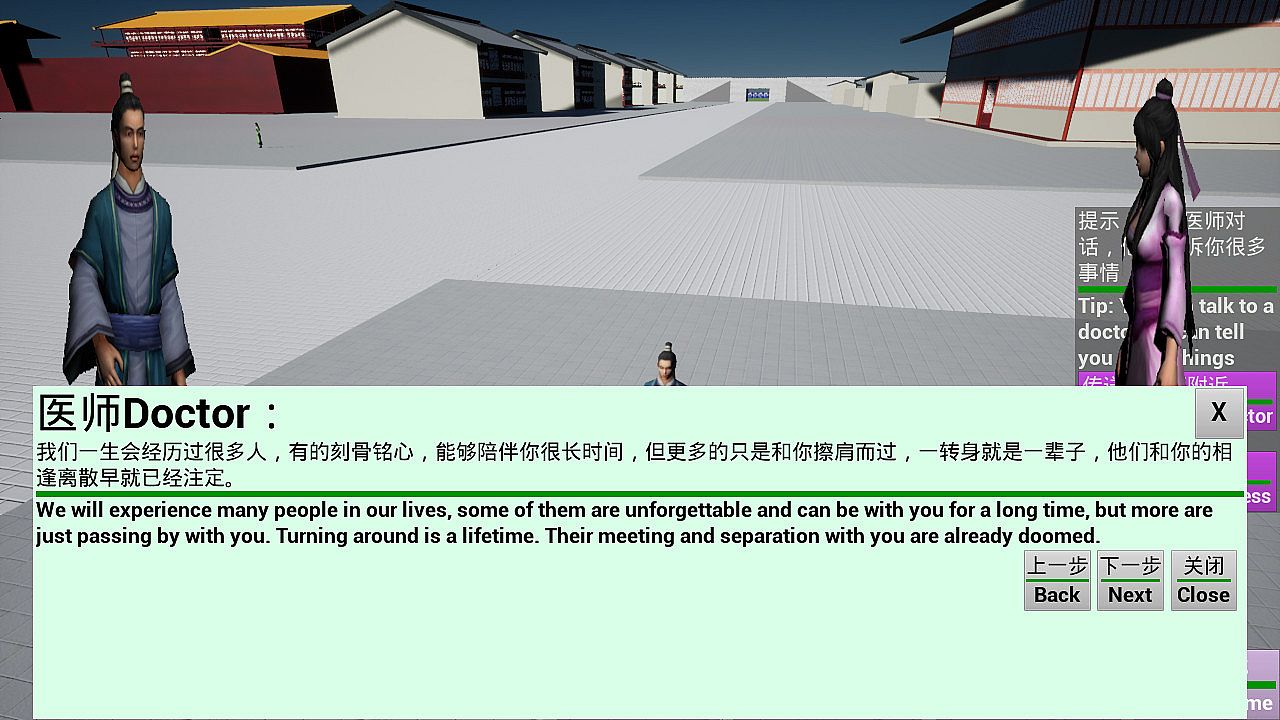 This is a very simple 3D single game, only a simple dialogue, the operation of the game and most of the same 3D games. The game scene is the style of ancient Chinese architecture, which is not important, but the dialogue with NPC. This is a simple game, and NPC dialogue does not need you to run around. There are no fighting and gorgeous special effects in the game.