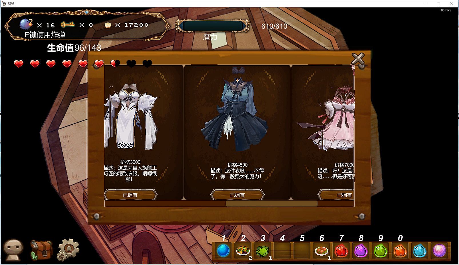 - 可以在人类村落里休息,制作食物(食用可以恢复生命值),更换装备,与村民对话。