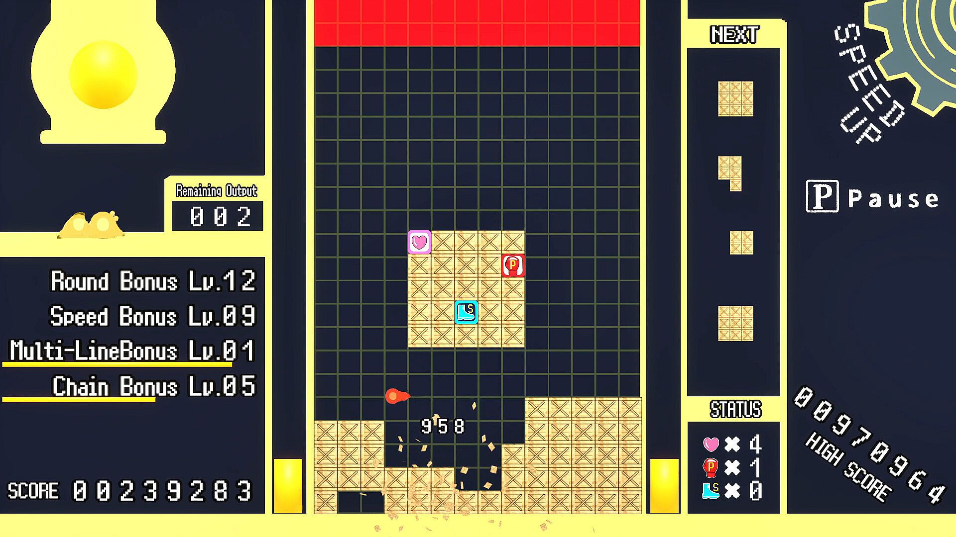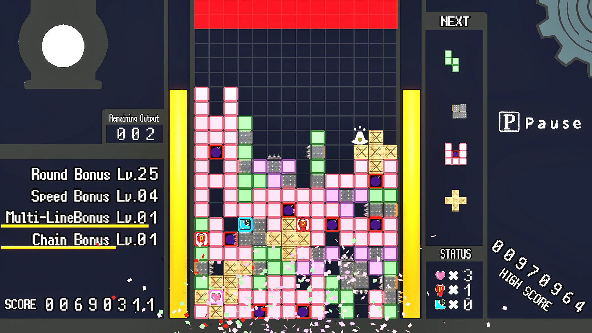 ZeliFactory is a falling-block puzzle × 2D action game where you simultaneously control the blocks falling from above and a freely moving Zeli on the screen, clearing lines to earn high scores.