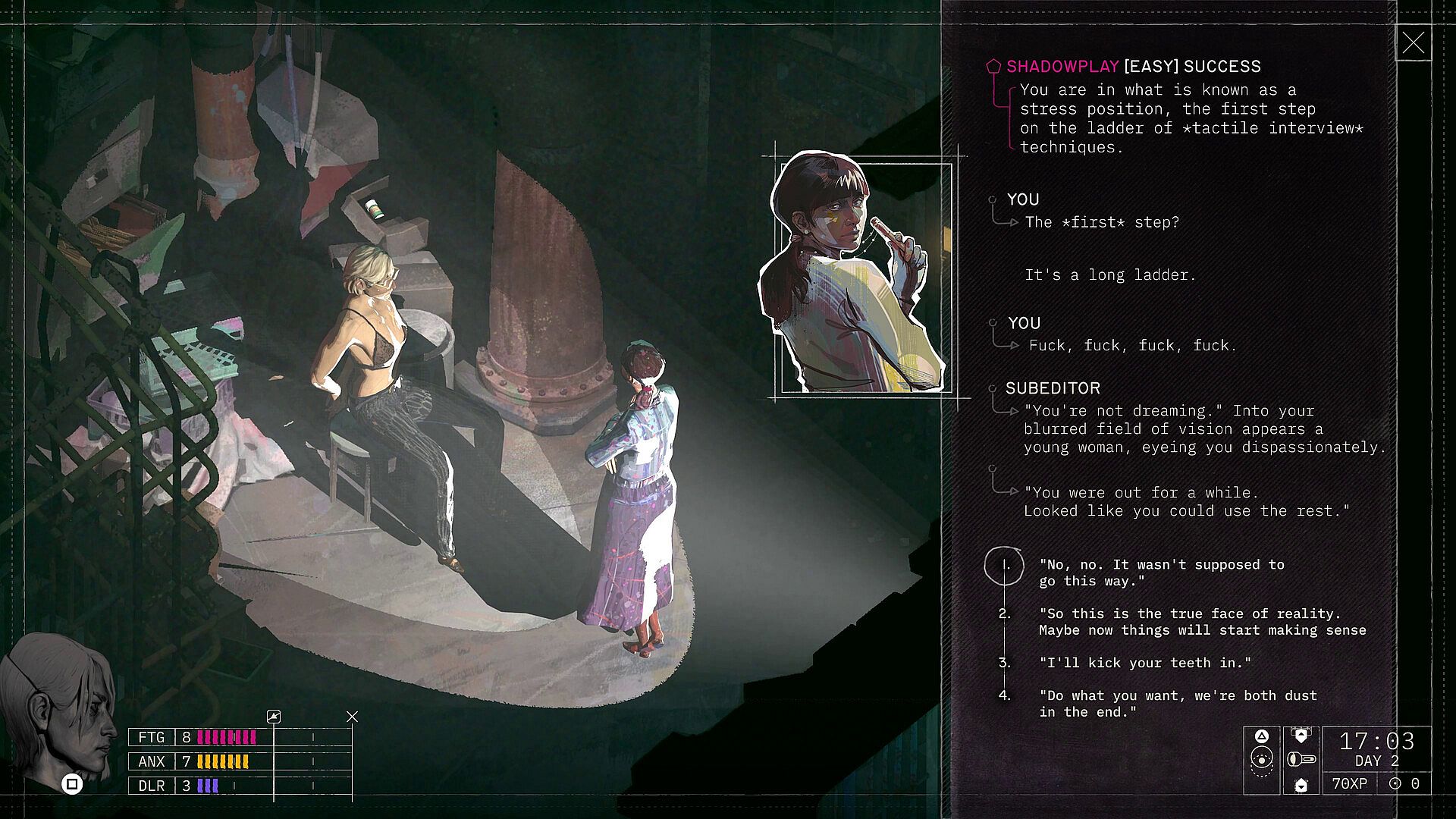 Fulfil the demands of your assignment by hunting down secrets hidden within the architecture of both the city and the human mind. Collaborate and clash with informants, loyalists, and agitators. Pass skill checks to get them to open up and improve your abilities with the experience you receive. The choices you make affect everything: the loyalty of your friends, the paths you can take, and the fragility of your mind.