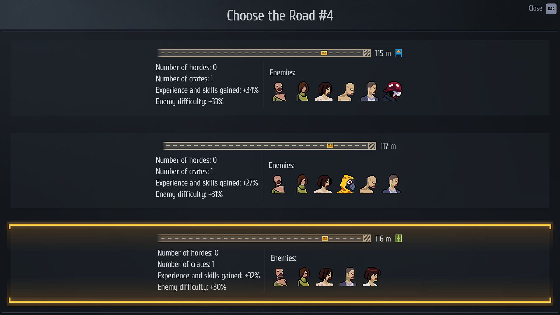 After each road you clear, you choose the next one — one of three. You decide what lies ahead. What matters more: to try your luck hunting for a new gun, to attempt an upgrade for your current one, or to push forward quickly?