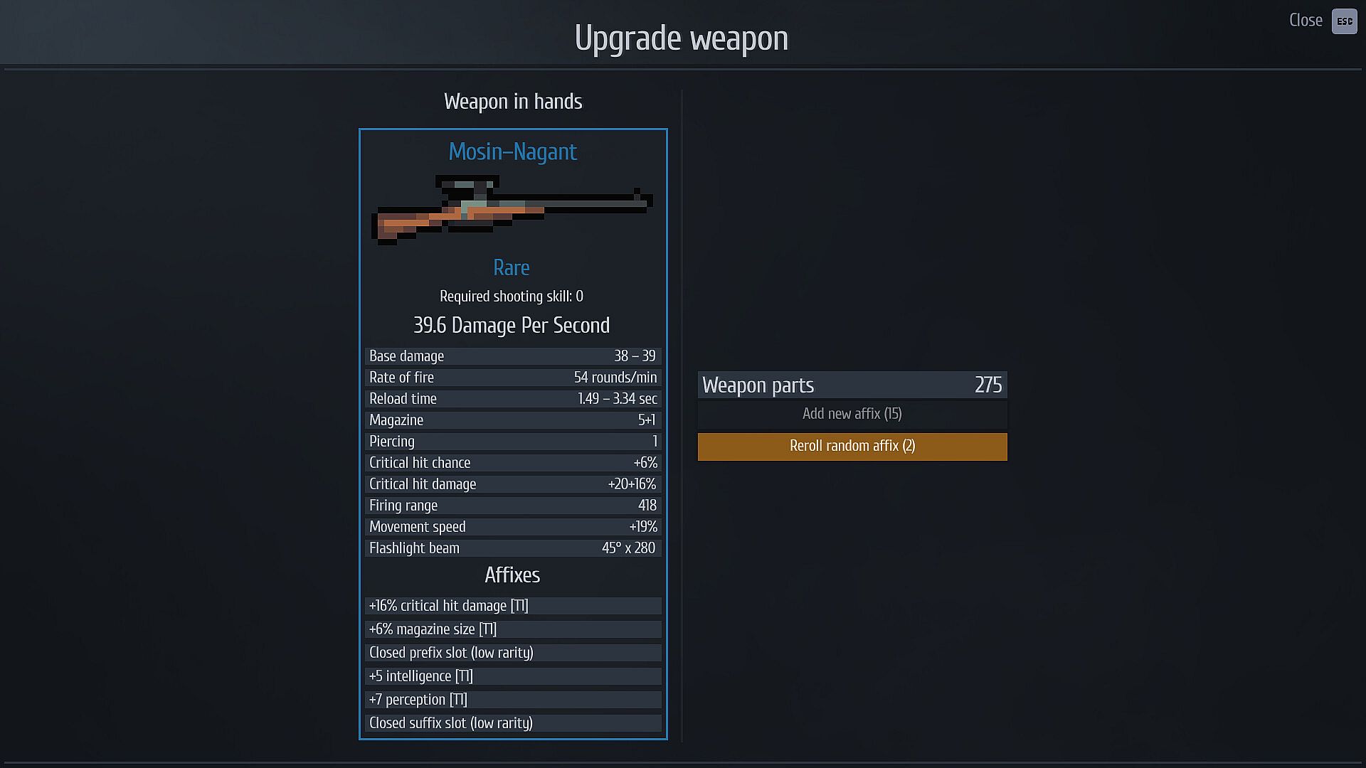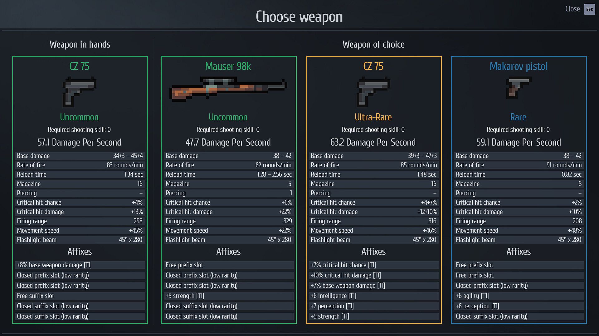 New weapons can only be found in gun cabinets at the end of certain roads. Each cabinet offers a choice of three weapons — pick one, leave the rest. A weapon's rarity determines its stats and the number of affixes it can have. Affixes are random modifiers that directly boost the weapon or enhance your character's attributes. Higher-level roads offer more powerful guns, of higher rarity, and with stronger affixes.