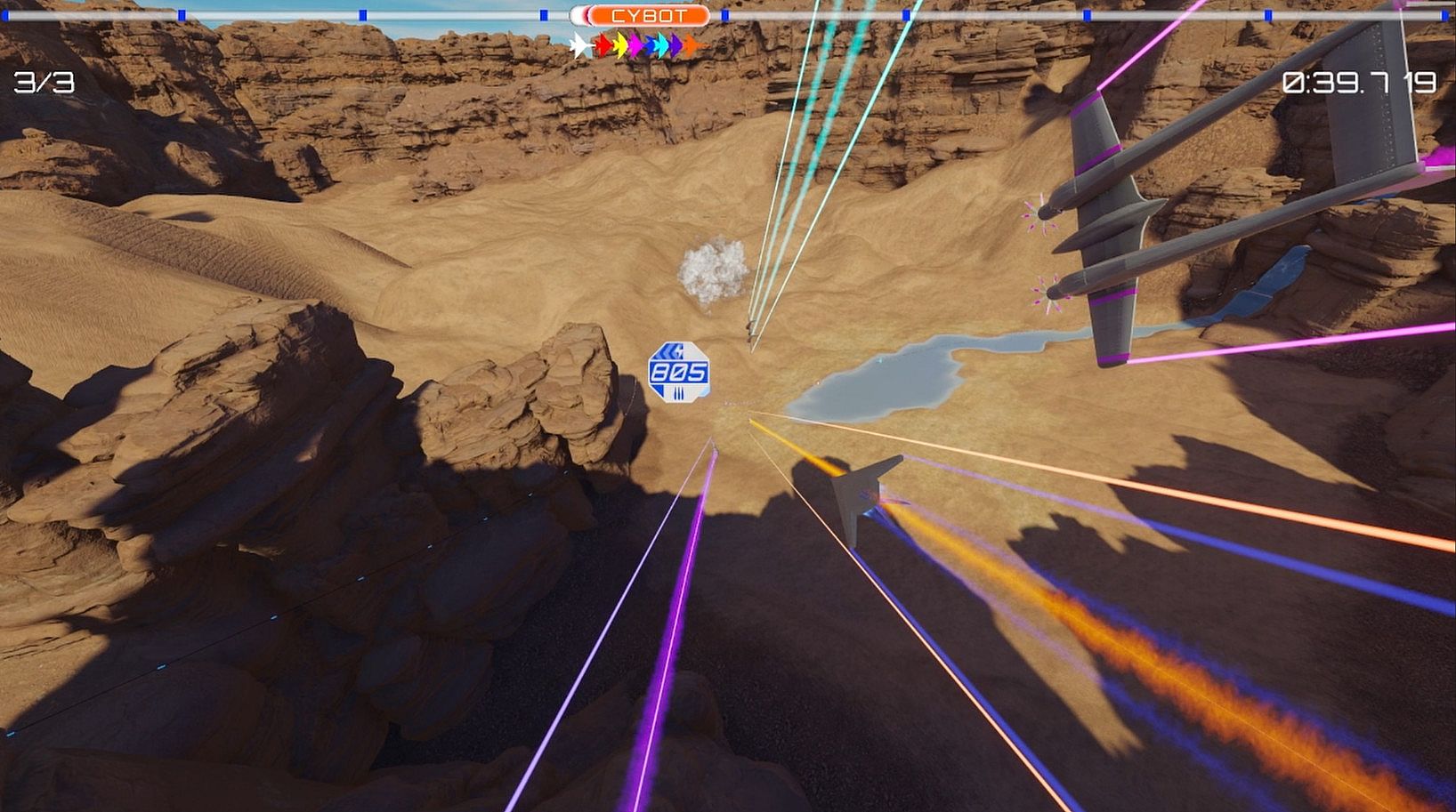 Out-maneuvering your opponents is only half of the battle in this racer. Currently with 4 distinct weapons and plans for many more, you'll have plenty of options to ruin your opponent's day. Bright and colorful explosions will litter the track as players aim to reduce each other's energy, which reduces their top speed.