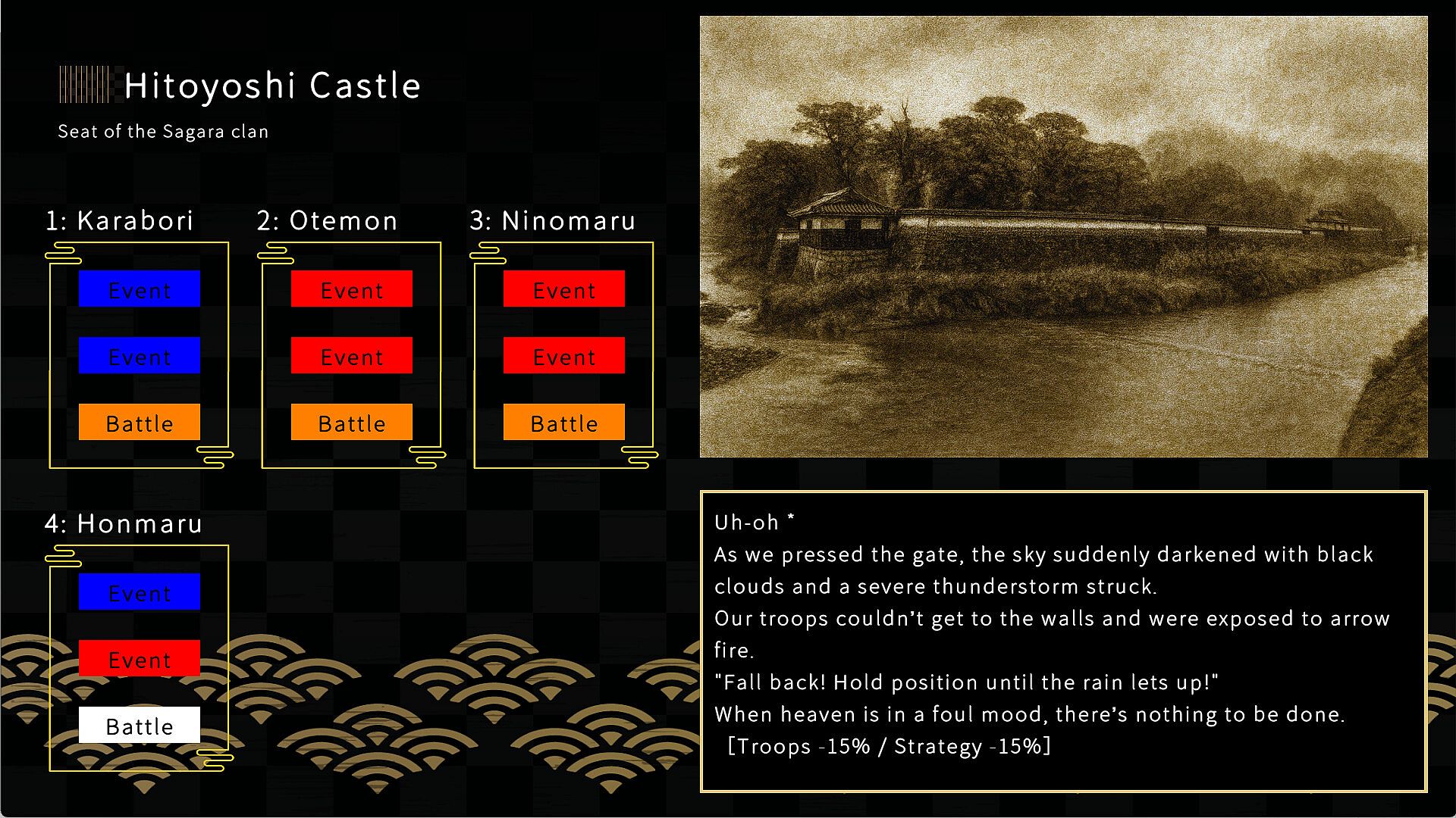 Depending on your progress in conquering enemy forces, various events—both good and bad—will occur. Overcome them all and aim for national unification!